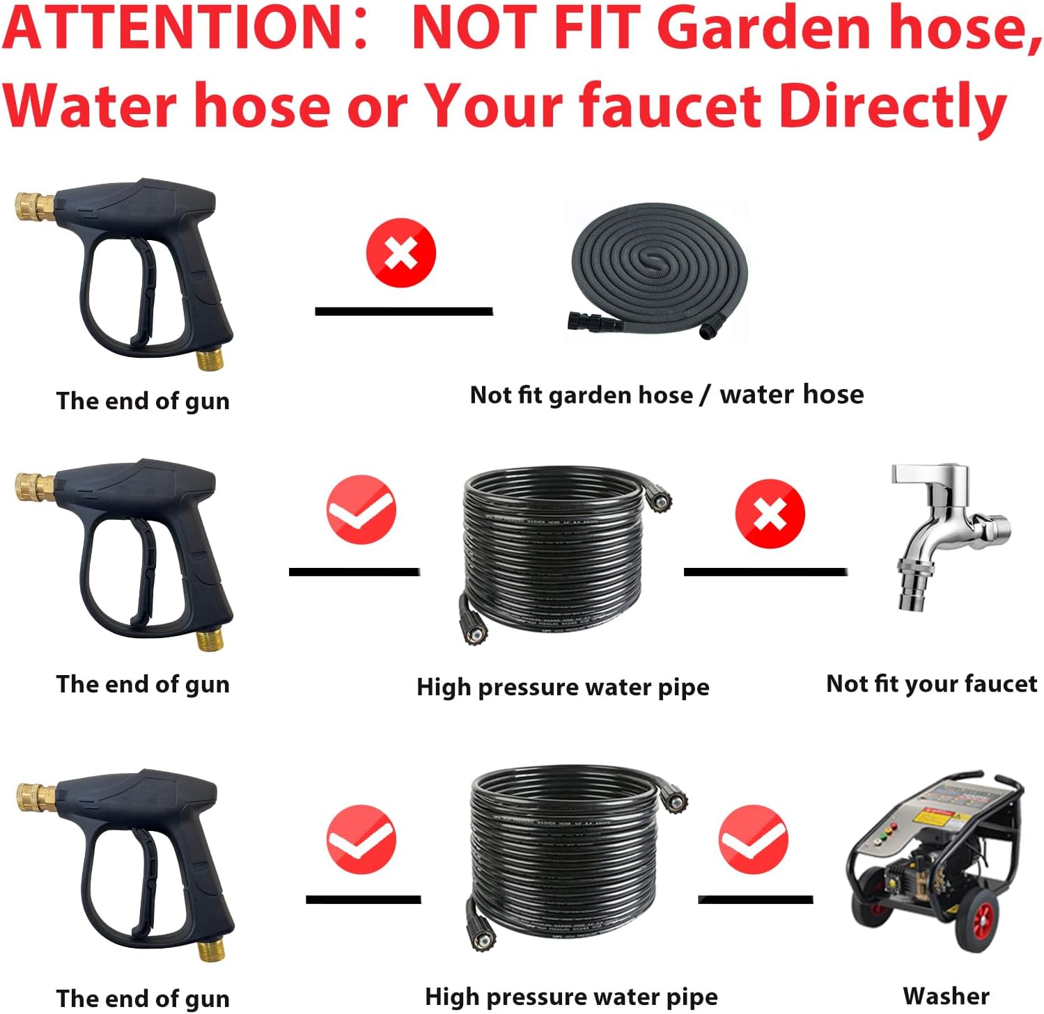 - ❀【Attention】Not Fit GardenHose, WaterHose or YourFaucet Directly, it must be connected to the hose of the high pressure washer before it can be used normally.
