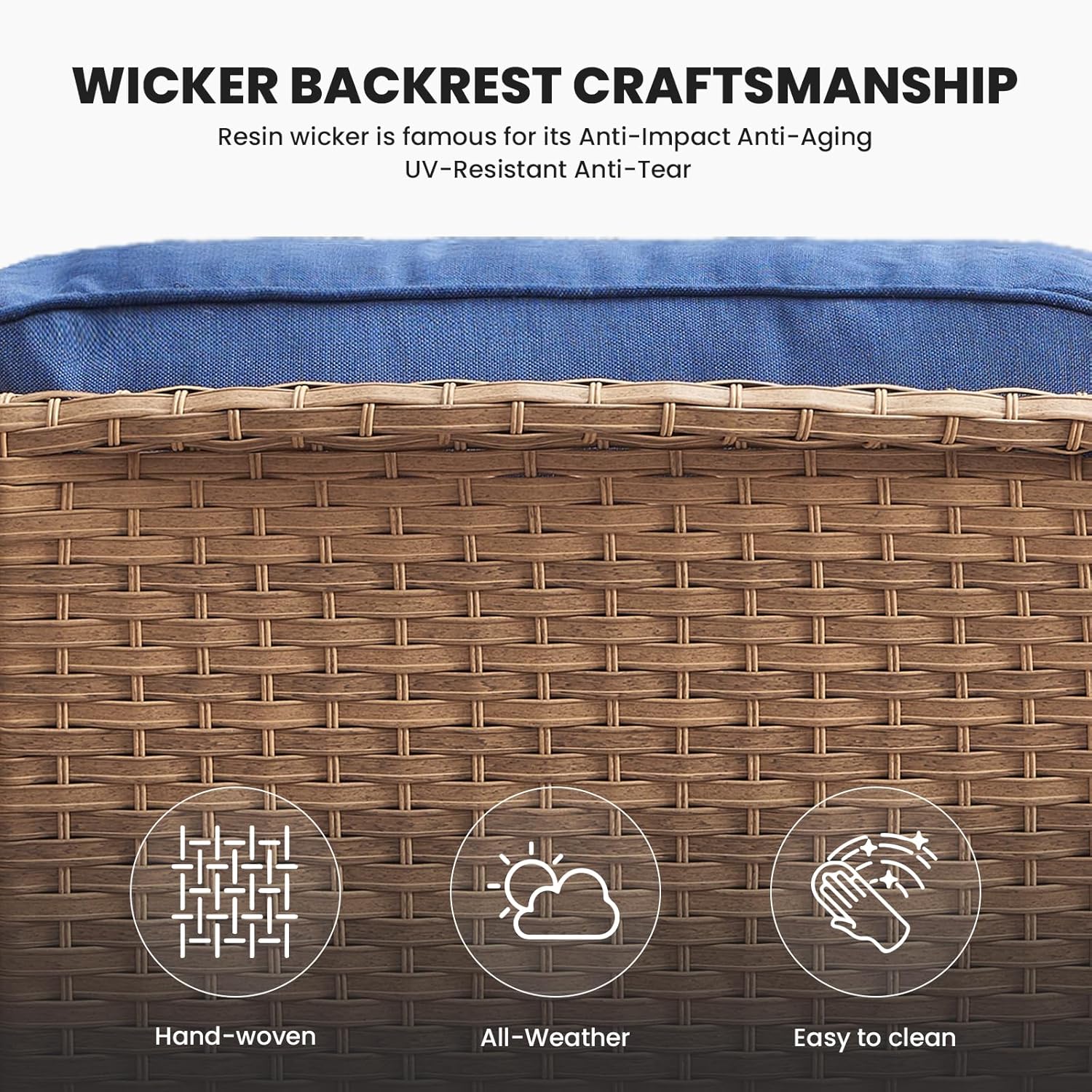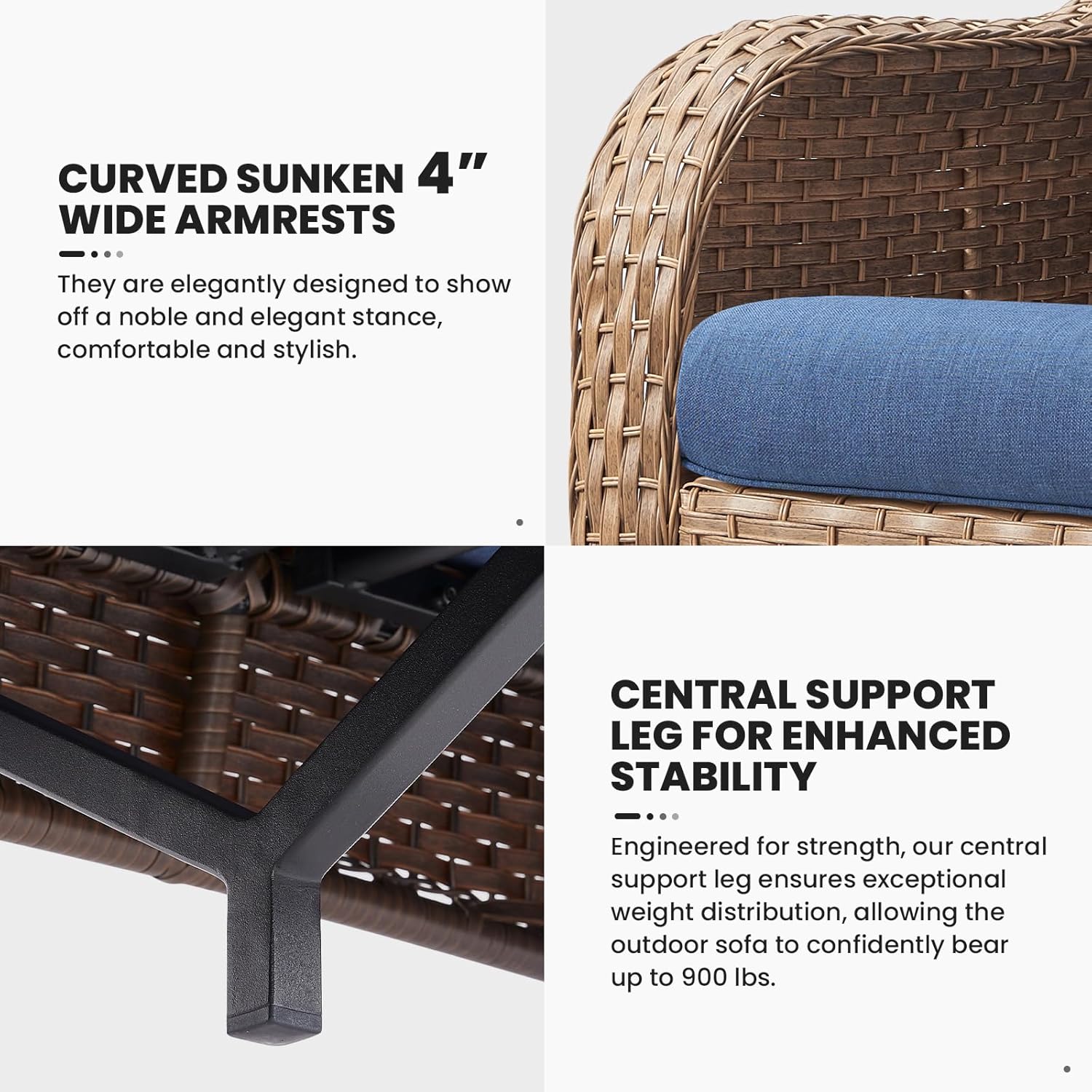- PATIO WICKER SOFA DETAIL :The outdoor 3-seater sofa includes hand-woven yellow wicker and soft couch cushions (blue, beige). The dimensions are L75* W 35* H 35 inches, with a weight capacity of 750 LBS. Comes with clear furniture assembly instructions and all the tools needed for easy assembly by 1 person.