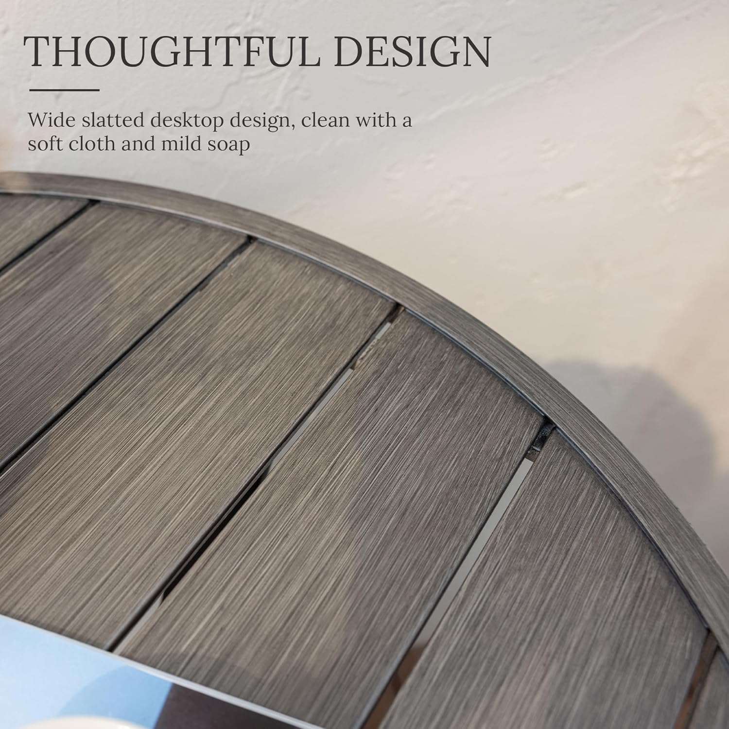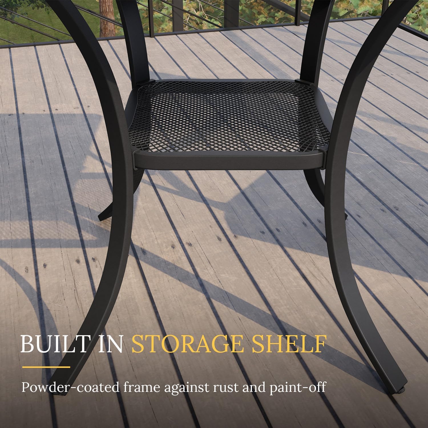 - The Outdoor metal steel table features a powder-coated, wood like-finish frame against rust and paint-off. Ideal for deck, patio, garden, porch, balcony or indoor