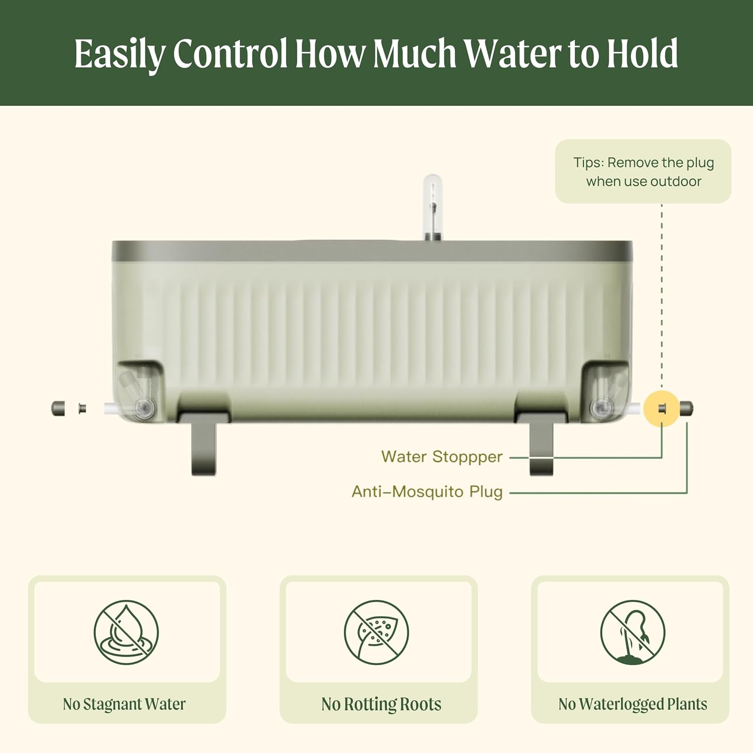 - Water Level Gauge & Drain Plug Design: The water gauge makes it easy for users to keep track of the water level. Adjust the lever to change the water storage volume based on the needs of your plant. There is a plug on the water level regulator (to prevent mosquitoes from entering the water tank). When used indoors, the water plug needs to be plugged to prevent water leakage. When using it outdoors, it is recommended to remove the water plug to prevent rainwater from soaking the soil in the basin when it rains.