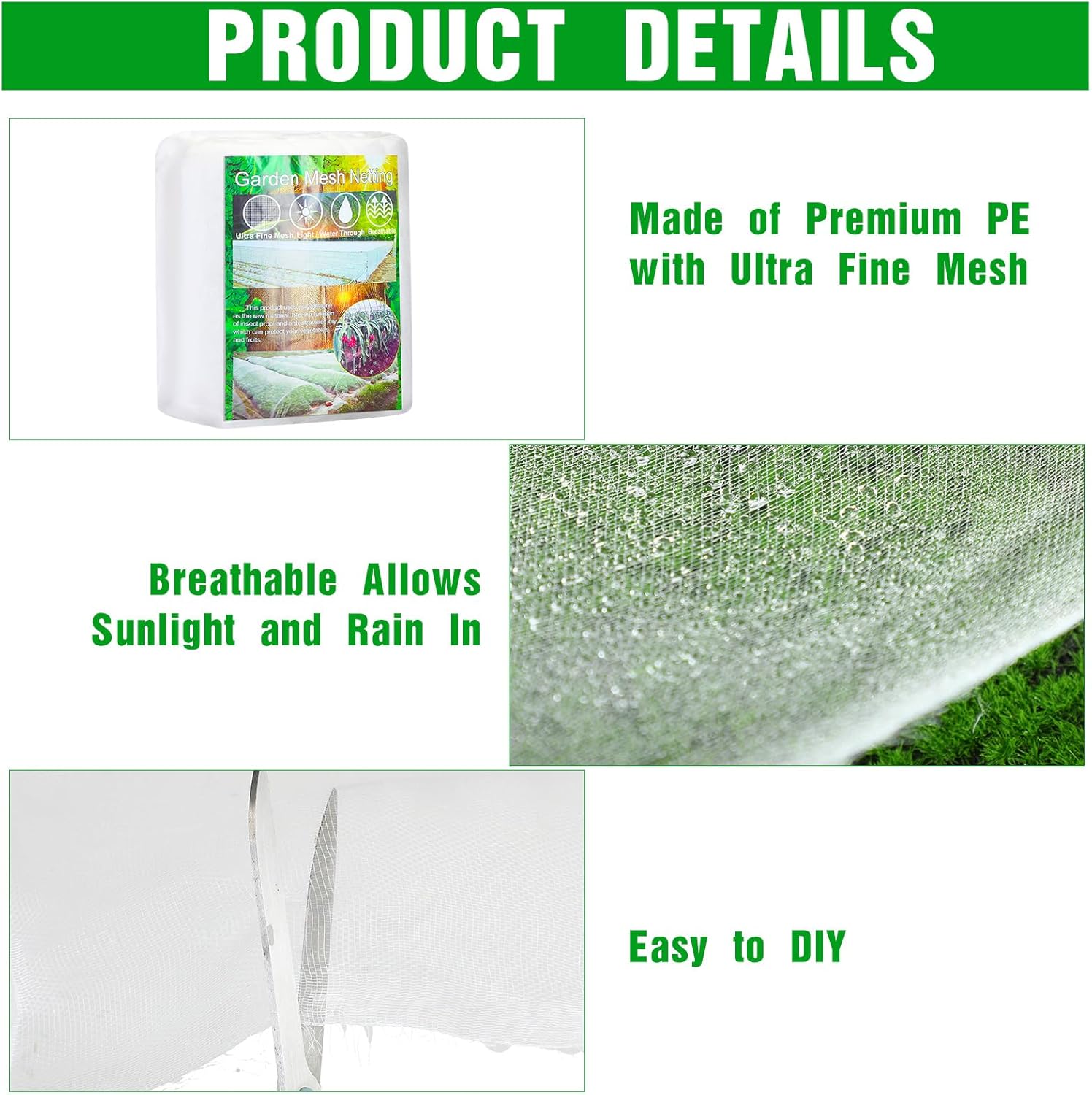 - Easy to Install and Customize: Lightweight yet tough, this insect netting for garden is simple to cut and shape to fit your specific needs; Whether covering large garden plots or smaller patio plants, it's a hassle-free solution that integrates seamlessly with hoops, stakes, or row frames