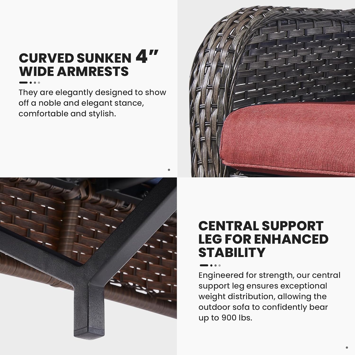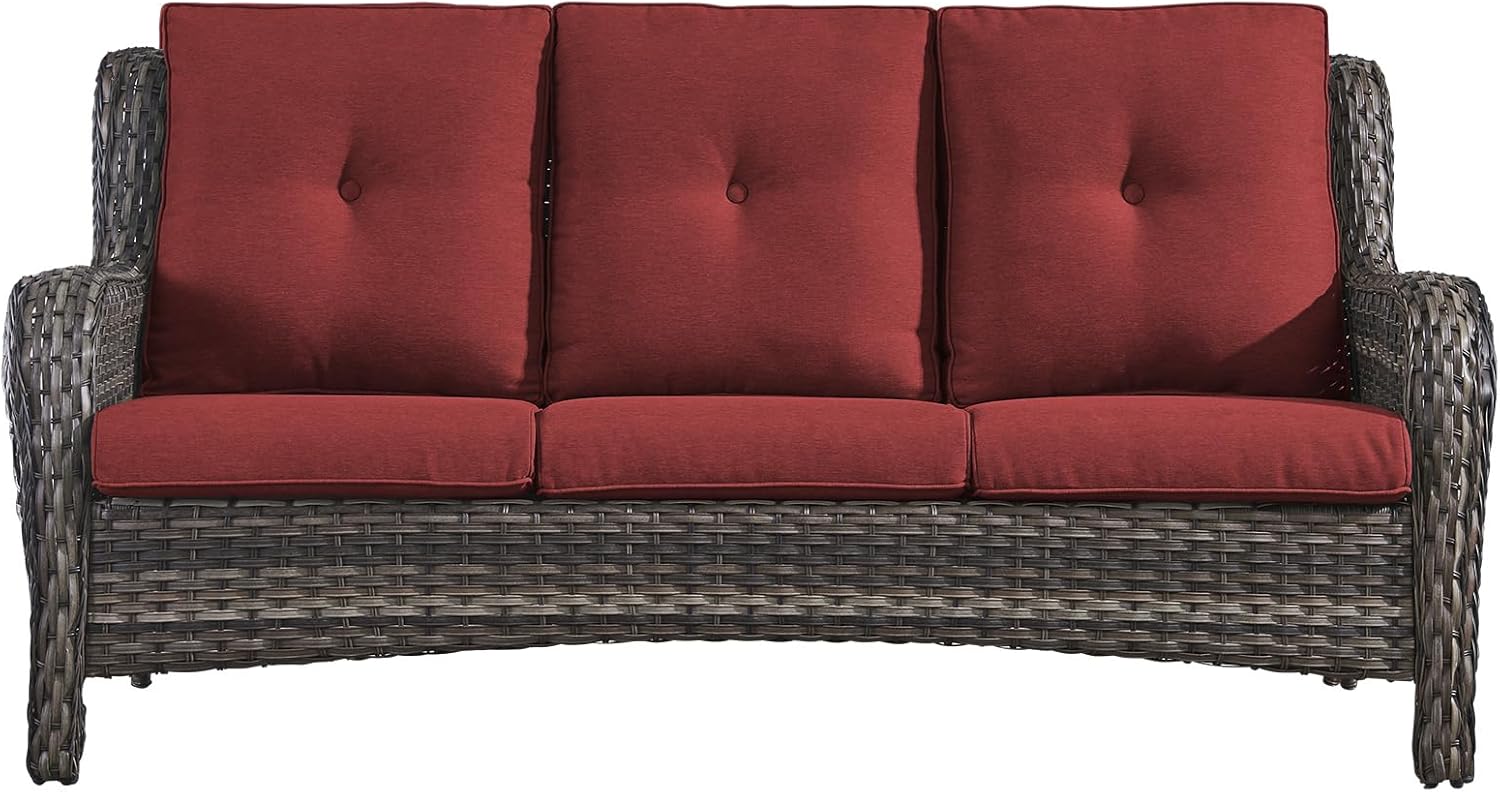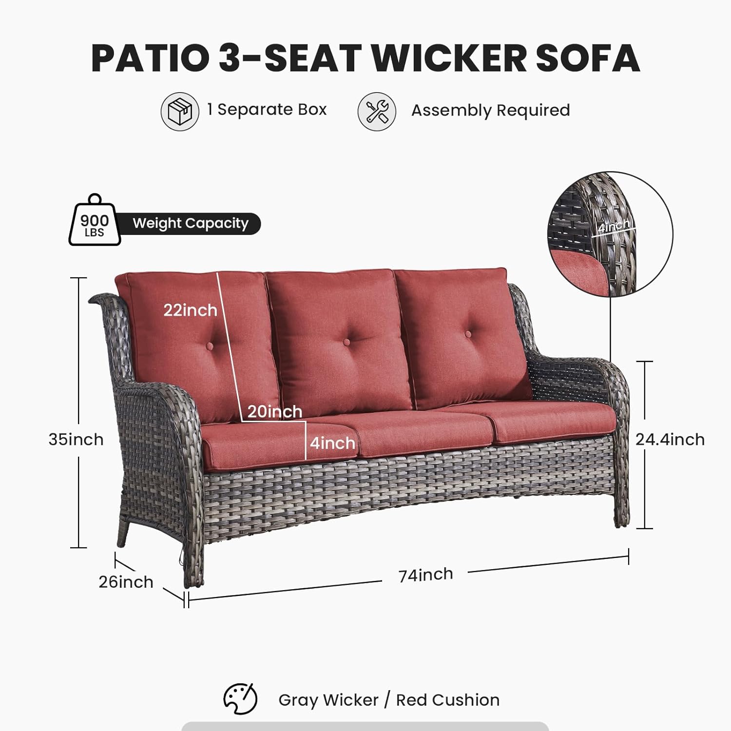 - PATIO WICKER SOFA DETAIL :The outdoor 3-seater sofa includes hand-woven brown/grey wicker and soft couch red cushions. The dimensions are L75* W 35* H 35 inches, with a weight capacity of 750 LBS. Comes with clear furniture assembly instructions and all the tools needed for easy assembly by 1 person.
