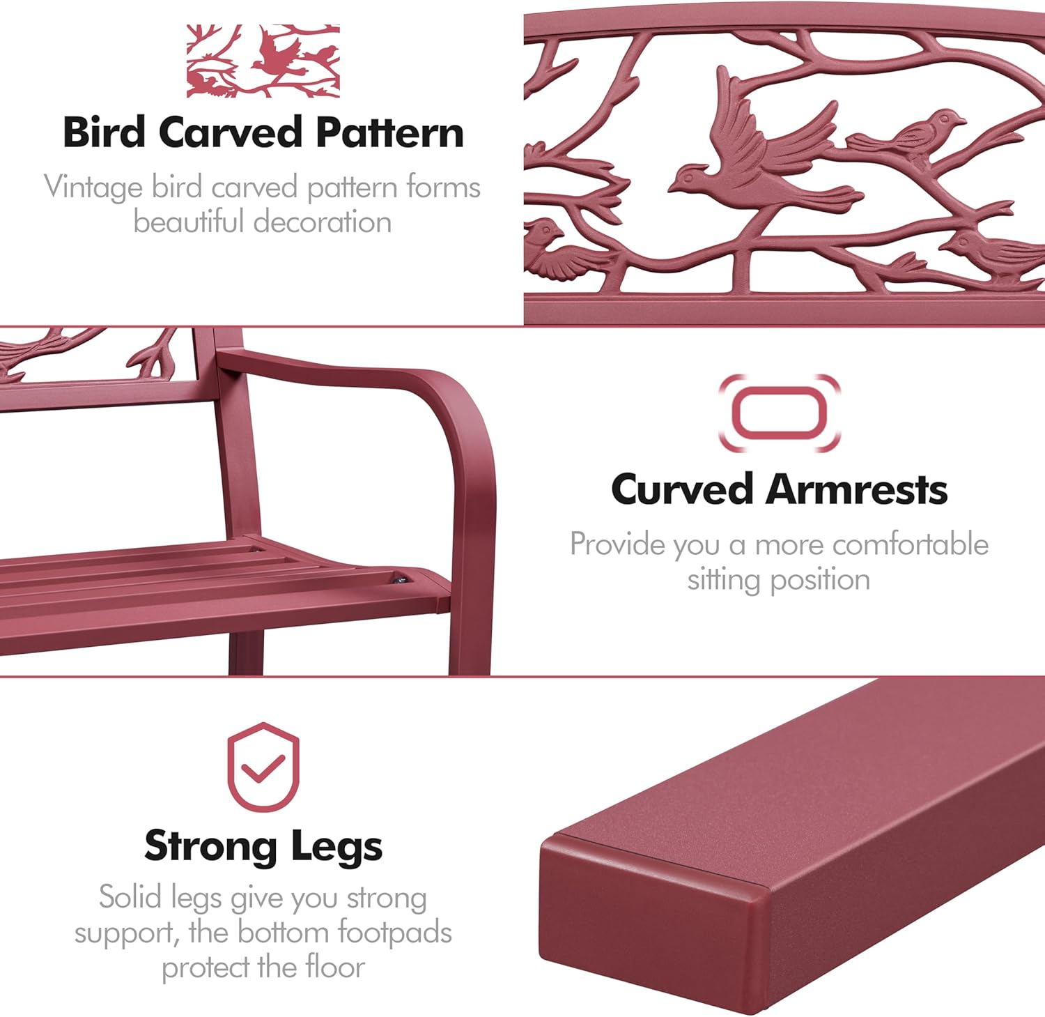 Yaheetech Outdoor Garden Bench Patio Furniture Chair Outdoor with Vintage Bird Pattern Backrest, Slatted Seat, Antique Metal Bench for Yard & Porch & Park, Red