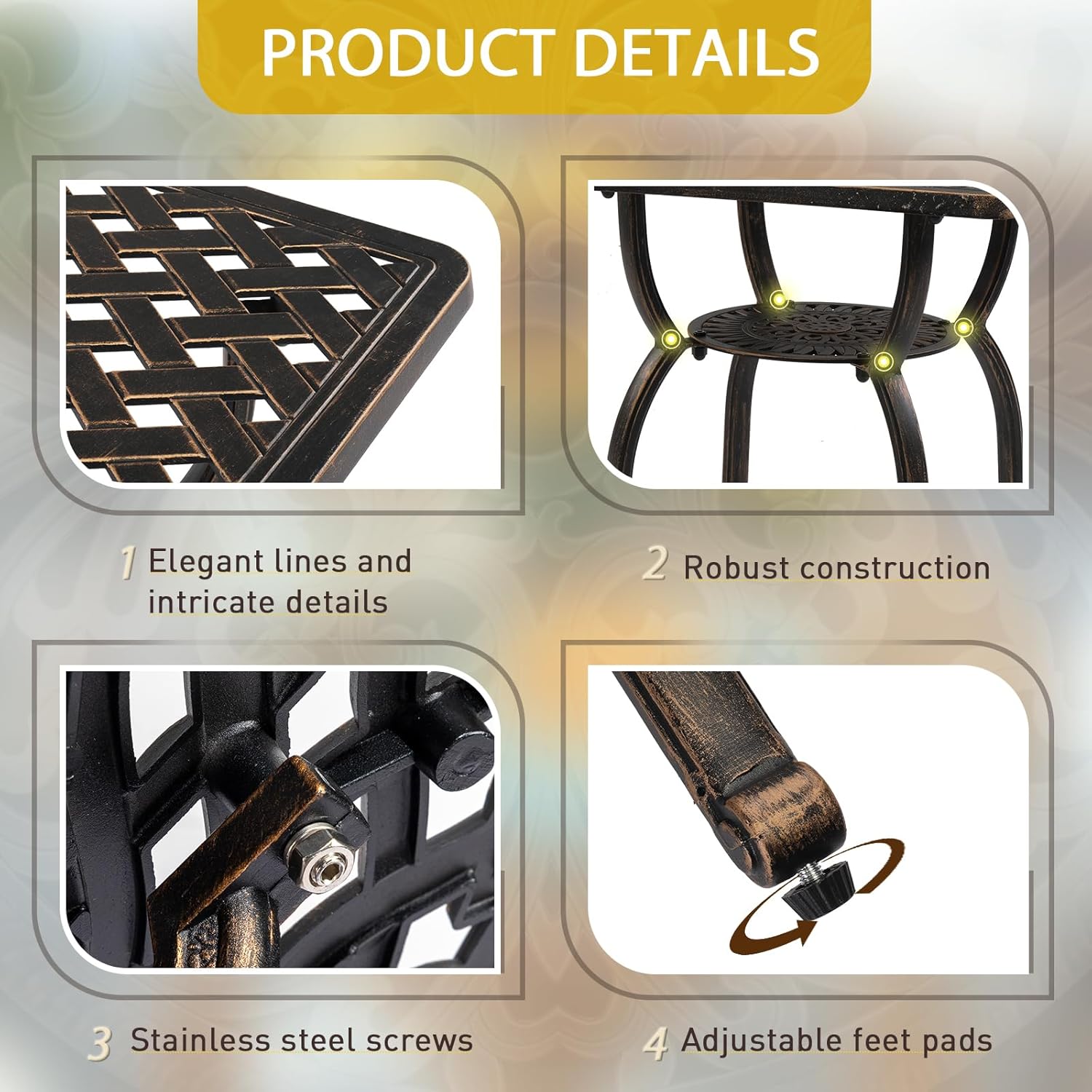 - PREMIUM CAST ALUMINUM: Crafted from high-quality cast aluminum, this round bistro table is built to withstand the elements. With exceptional durability, weather resistance and rust-proof features, it ensures long-lasting outdoor enjoyment with minimal maintenance required