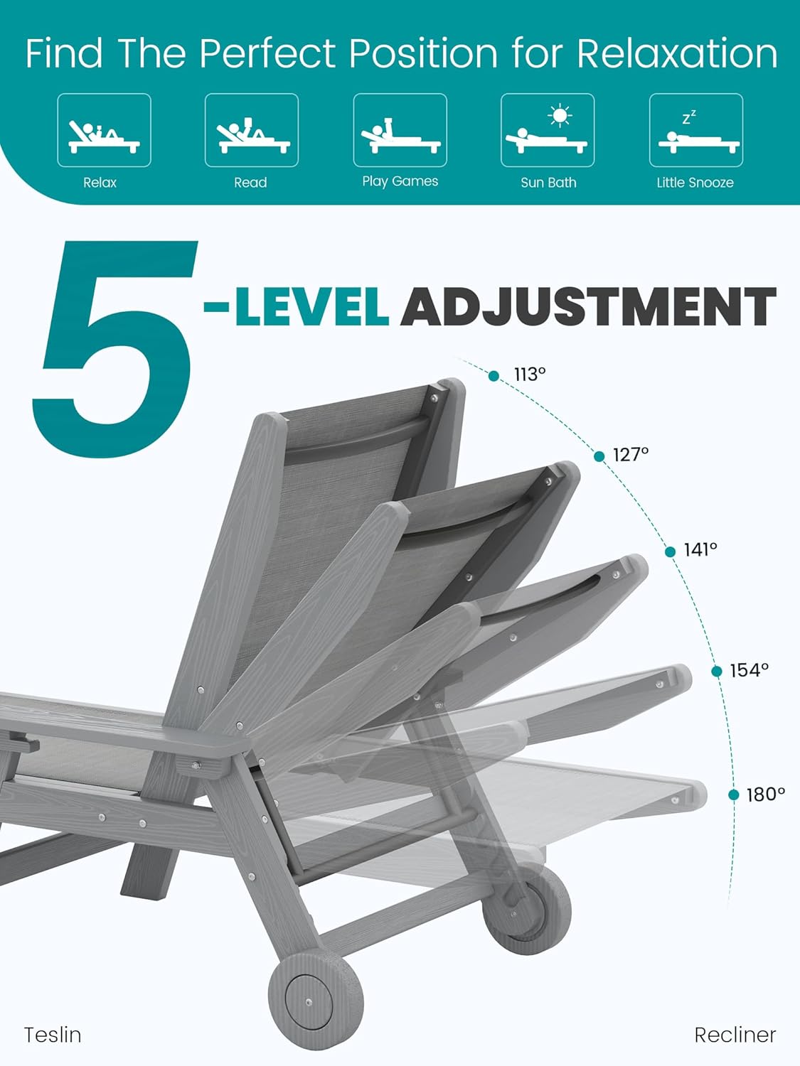 SERWALL Patio Chaise with 5 Positions - Textilene Outdoor Lounge Chair, Rolling Wheels - Poolside, Deck, Grey