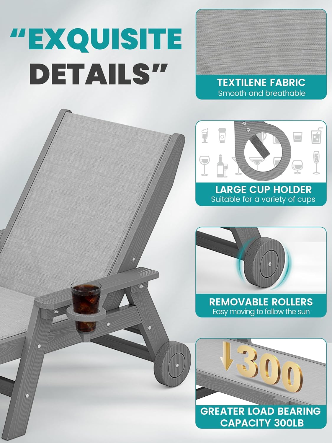 - Rolling Wheels: Equipped with convenient wheels, our chaise lounge chair is effortlessly portable. You can easily move it around to follow the sun or find shade throughout the day, providing you with the flexibility to create your ideal lounging spot.