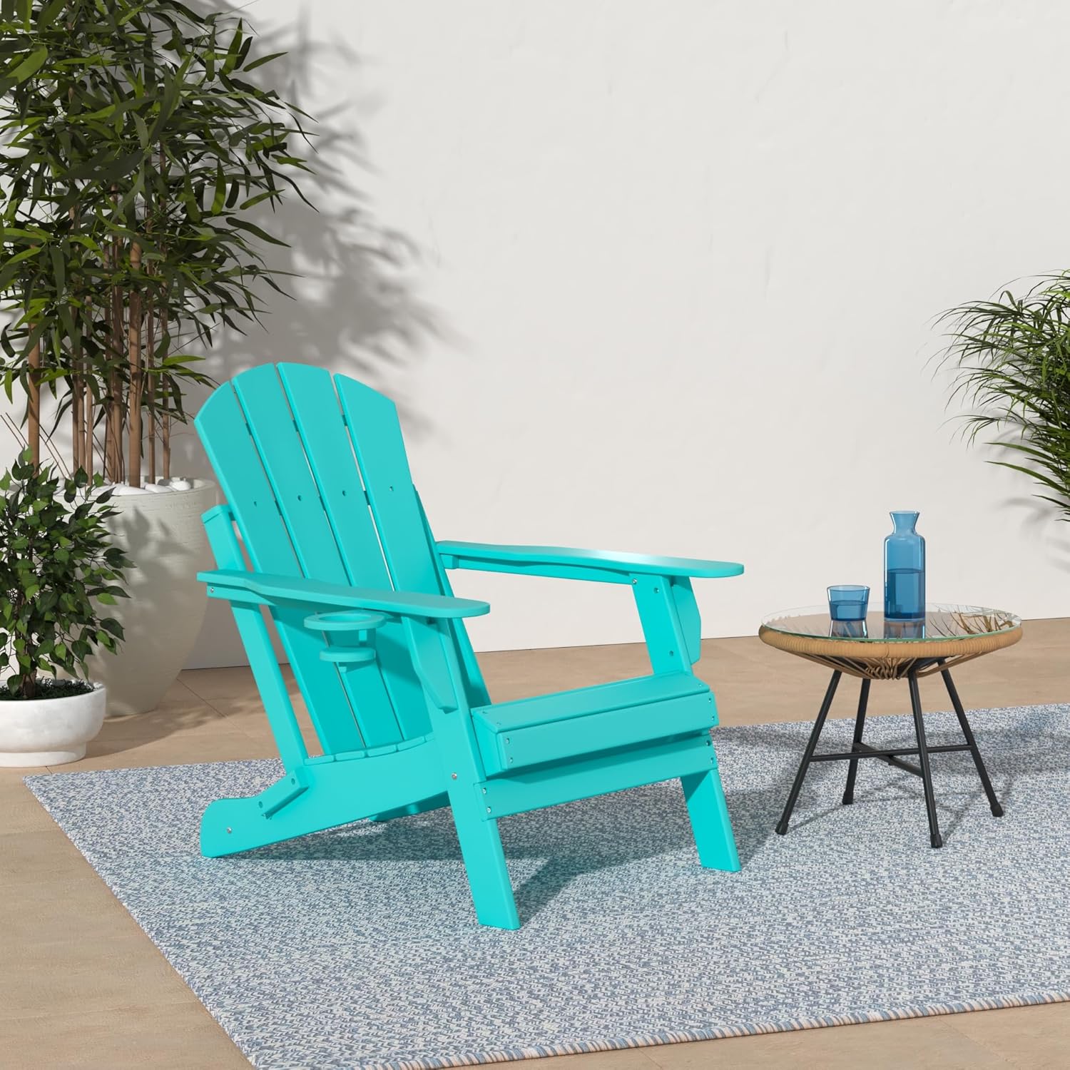 - 【Ergonomic & Foldable】 GreenVines Folding Adirondack chair features a hidden cup holder in the right arm, offering ample space for drinks or media devices. The reclined legs are designed for stability without the need for pins or chains. Easily foldable, this chair is perfect for storage at home or for taking on road trips. The slatted seating ensures quick drying after rain, while trimmed edges enhance safety for you and your family