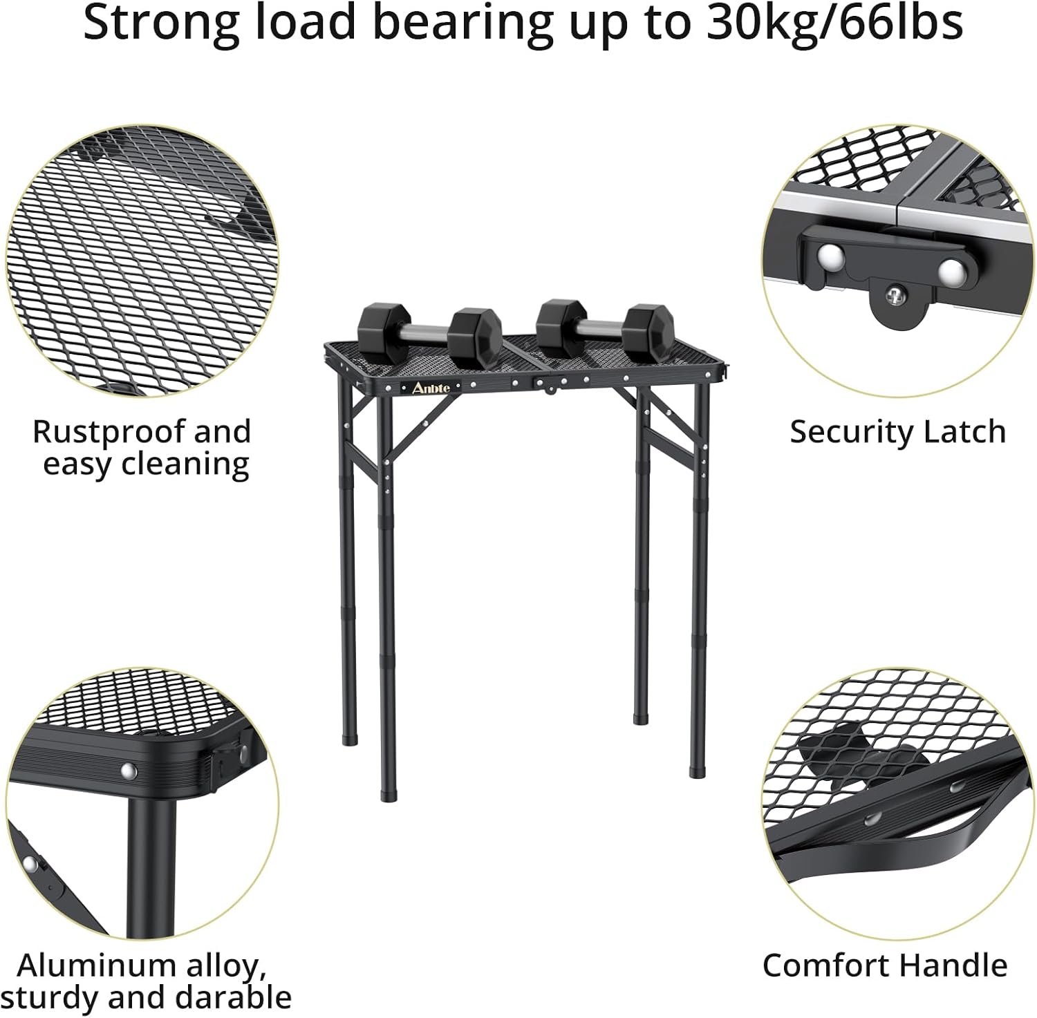 - Premium Quality Material, Stable and Sturdy: Anbte outdoor grill table is made of updated and thickened aluminum frame, very durable. Side snaps secure the tabletop in place and keep it level. U-shaped frame improves the stability of the table