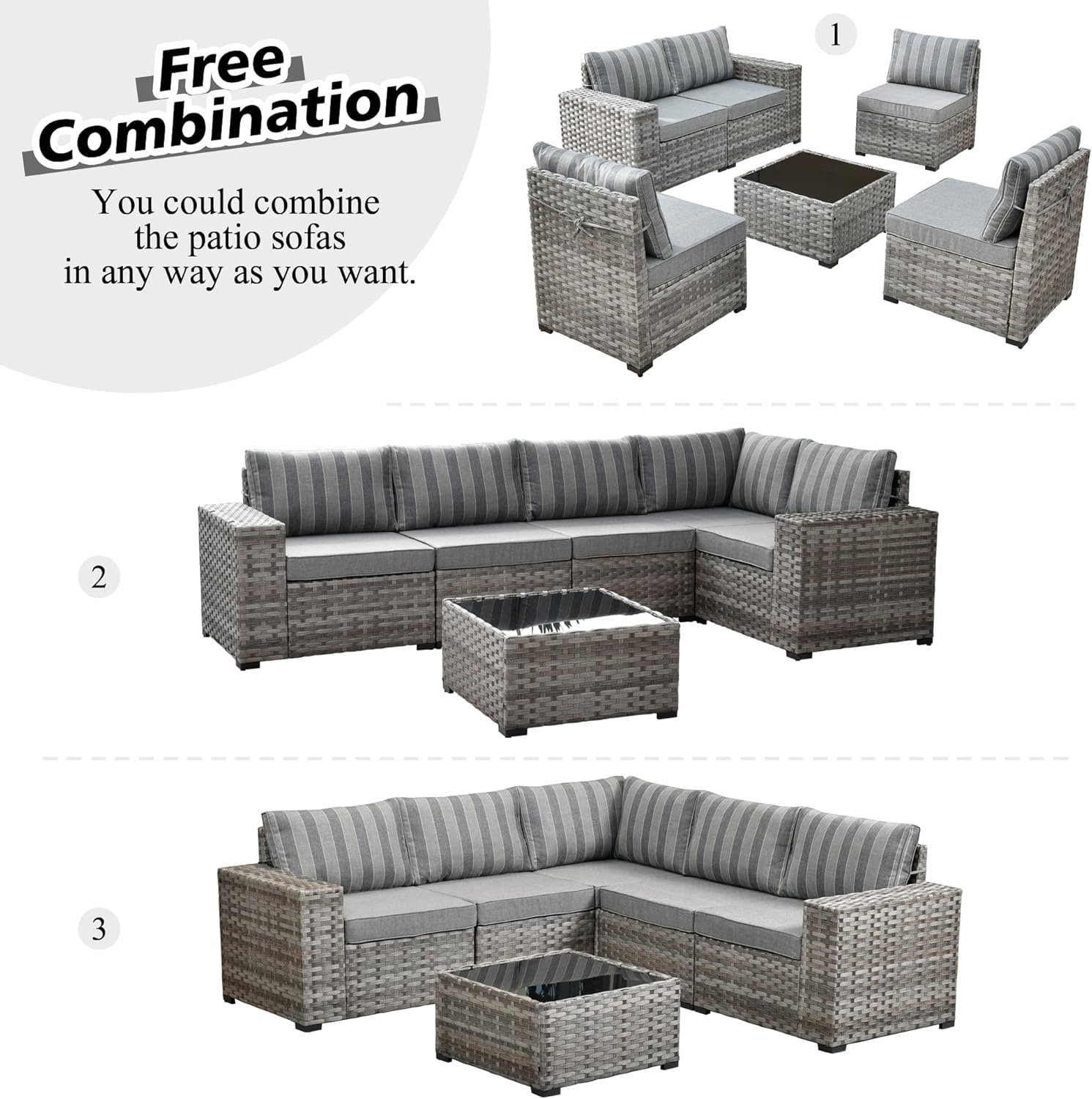 HOOOWOOO Modular Patio Outdoor Sectional Furniture Set,6 Piece Wicker Conversation Sofa Set,Out Door Couch Set with Wide Arm for Outside All Weather(Grey Stripes)