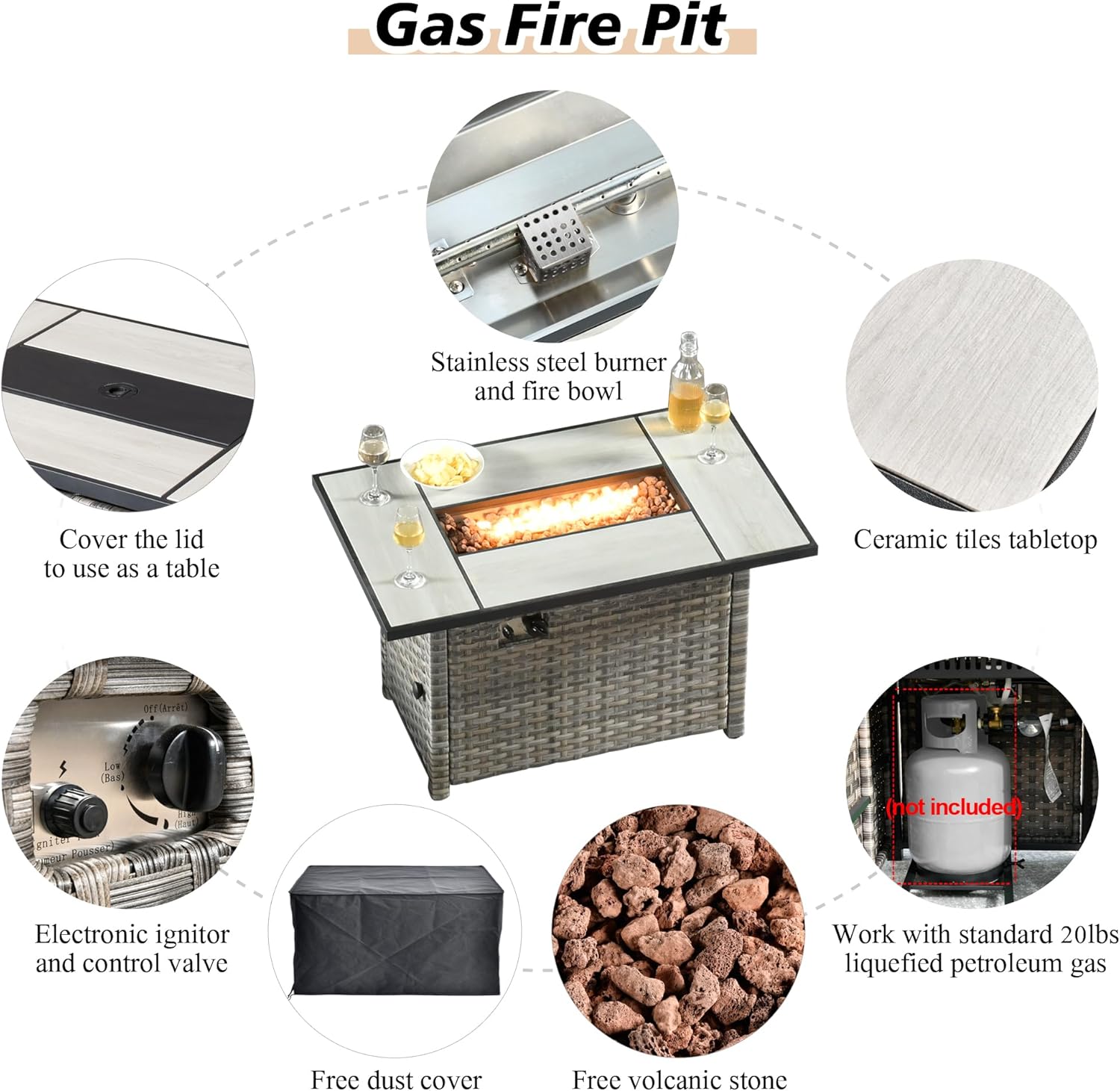 • FirePit Table Included: Comes with a square convertible propane gas fire pit table. Night time use it as a fire pit table to add atmosphere. Day time use it as a tall Dining table with the burner lid. Stainless Steel Burner withstands all weather. CSA certificated for safety.