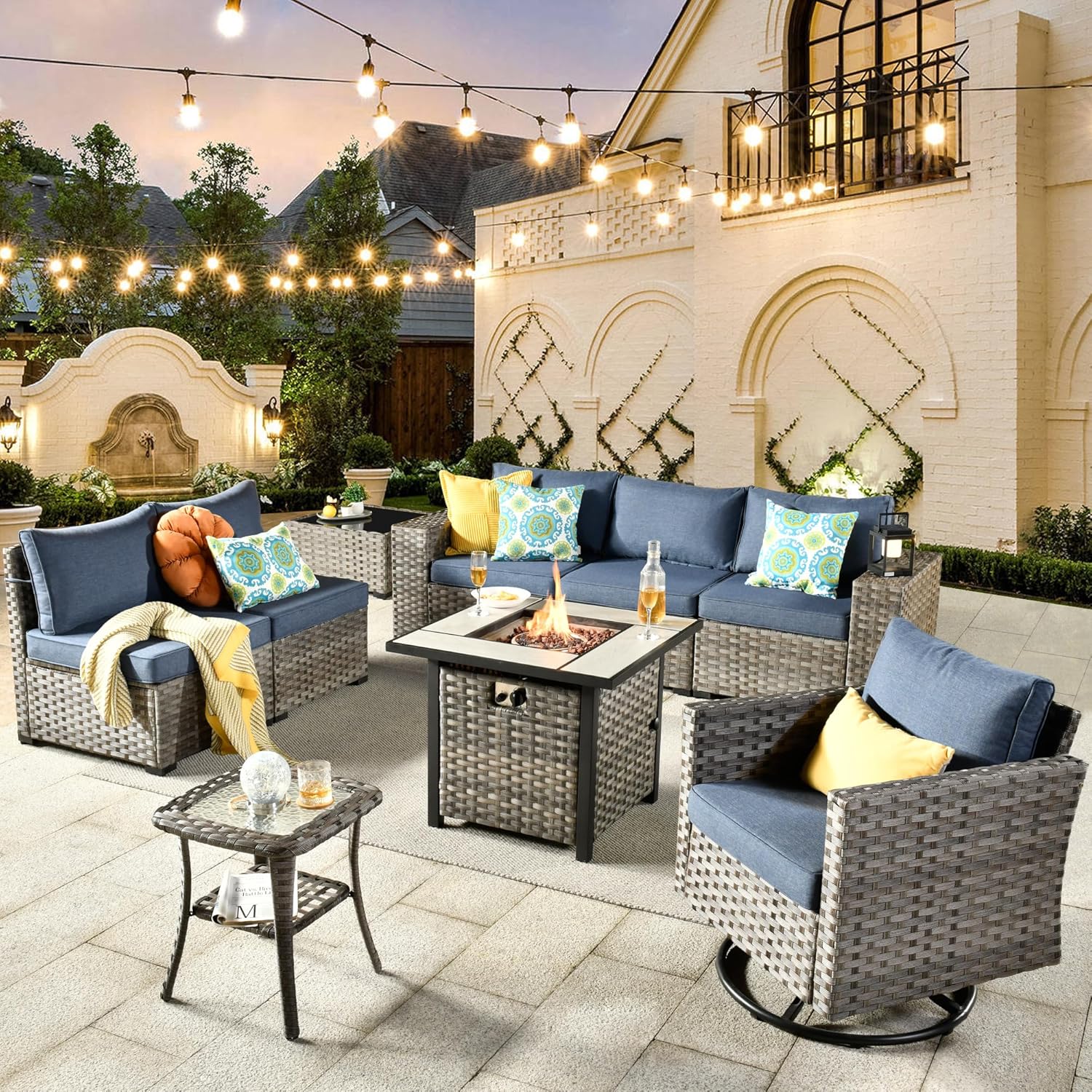 HOOOWOOO 9 Piece Modular Patio Outdoor Sectional Furniture Set with Gas Propane Fire Pit Table,Wicker Conversation Sofa Set with Swivel Chairs,Outside Couch Set(Denim Blue)