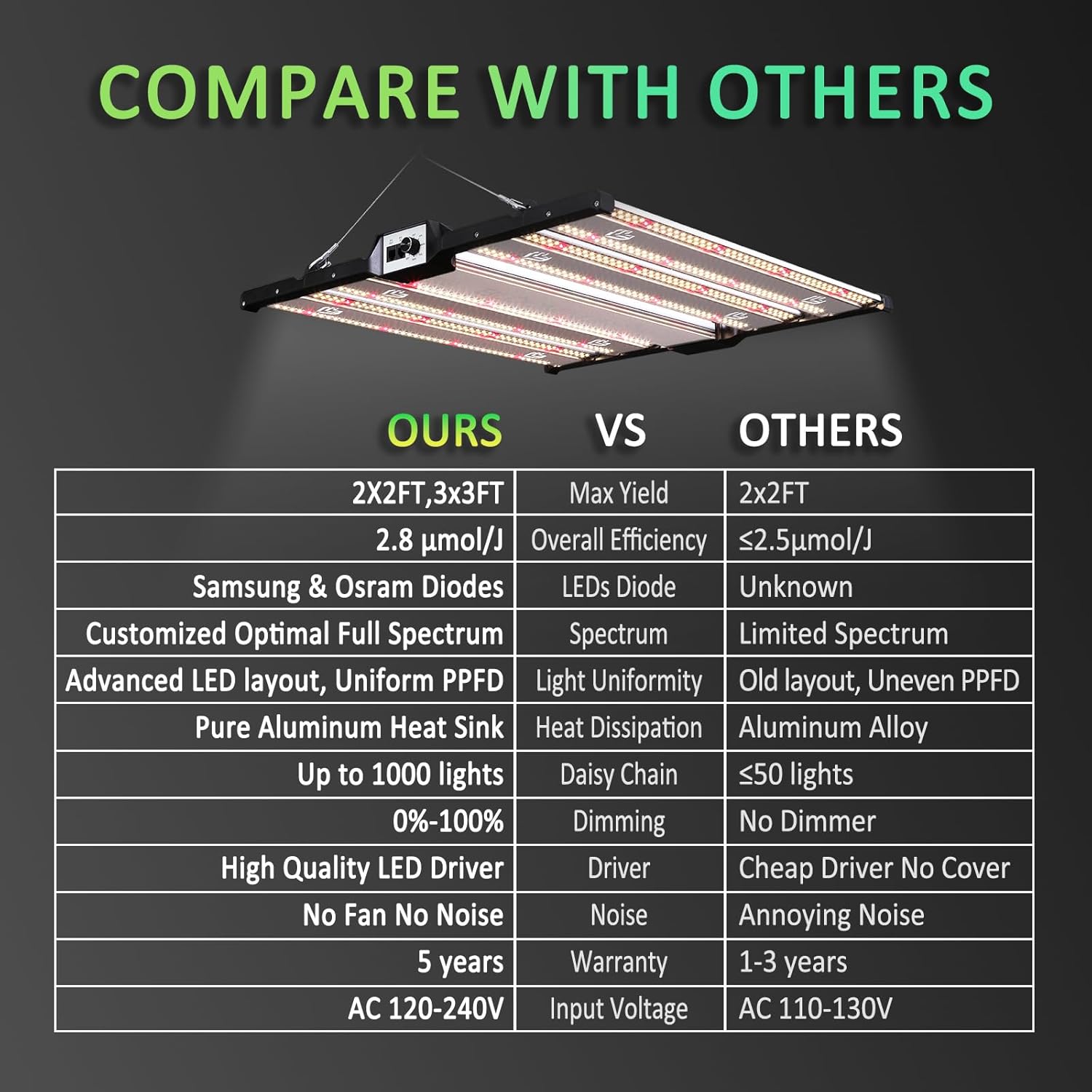 - ☀ Our new LED plant grow lights have a powerful light output and uniform canopy penetration with better light absorption by plants. It uses the high-efficiency LED plant light technology and premium Samsung LM301B diodes, which deliver an overall PPE of 2.8 μmol/j and the energy consumption is only 200 watts, providing you the excellent choice for you with cost-effective.