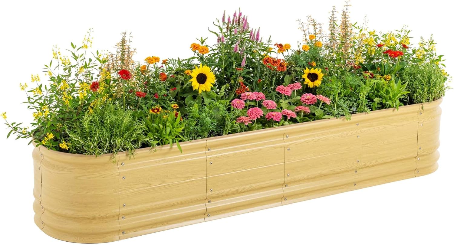 Vego garden 17" Tall 9 in 1 Novel Wooden-Look Metal Raised Garden Bed Kits Modular Planter Beds with 2 in 1 Wrench & Magnetic Plant Tags for Vegetables Flowers, Sunlit Oak