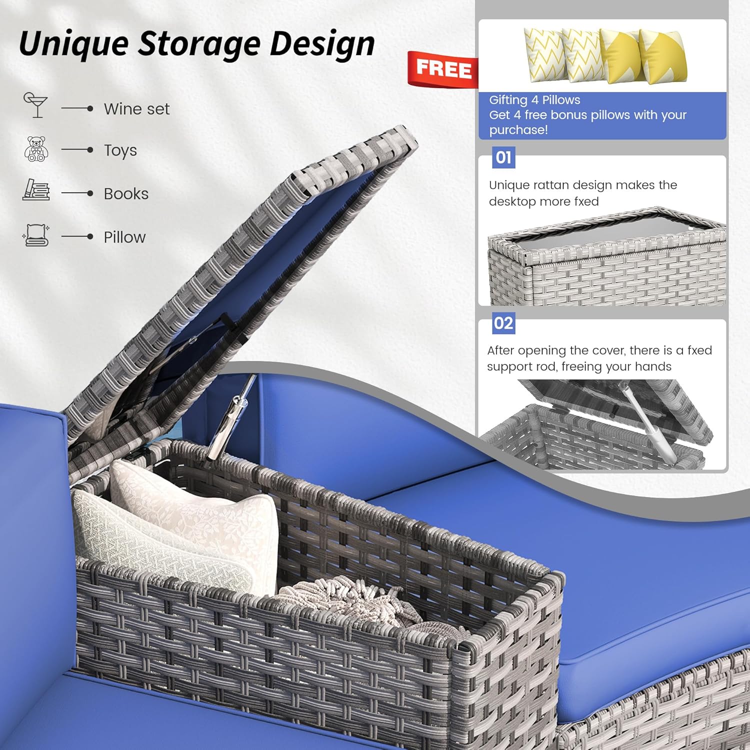 Patio Sectional Furniture Outdoor 8-Piece Grey Rattan Curved Sofa Set with Fire Pit Table,Storage Table,Pillows,Fit for Pool Backyard Balcony Porch Lawn (Navy)
