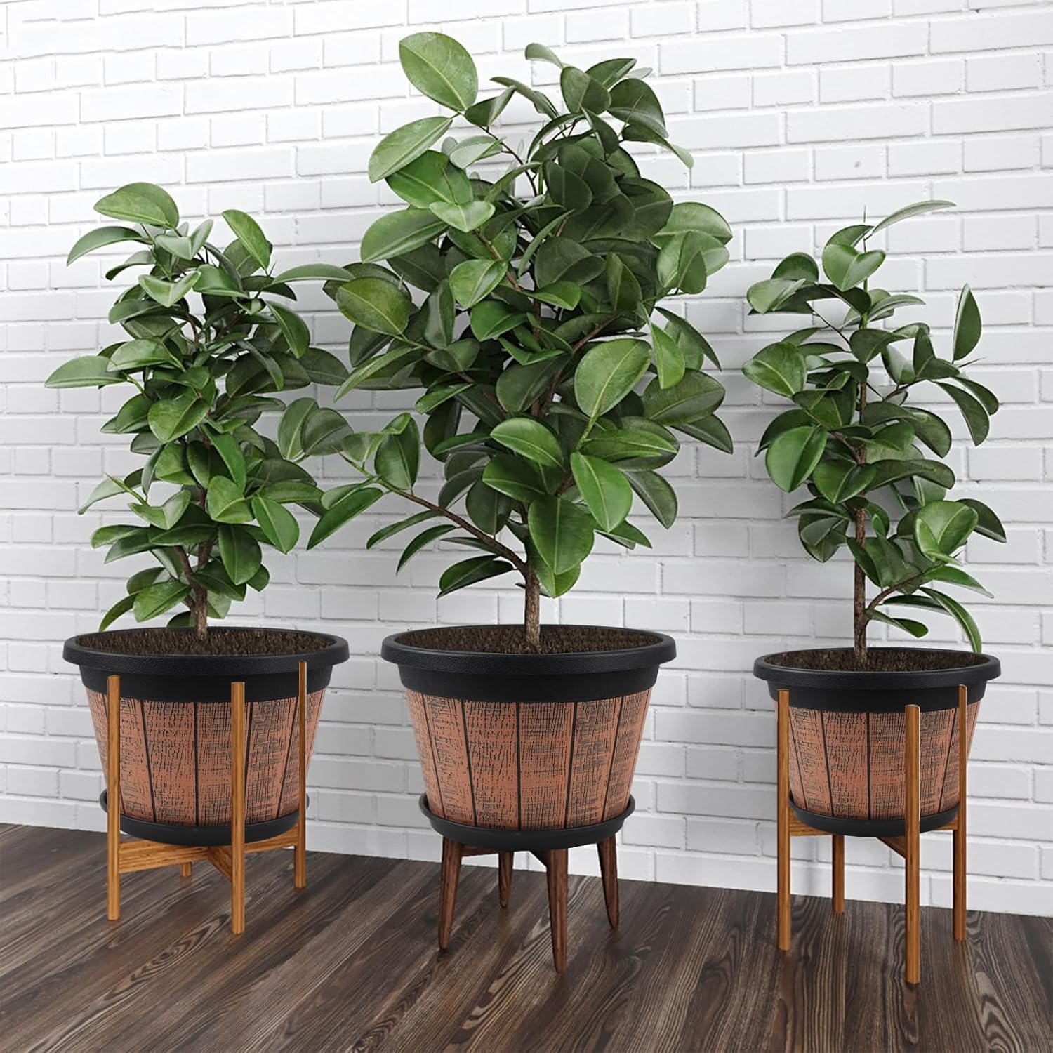Quarut Large 4 Pack 14 inch Plant Pots,Whiskey Barrel Planters with Drainage Holes & Saucer,Plastic Decoration Flower Pots Retro Design,Planters for Outdoor Indoor Garden Balcony Plants (Brown)
