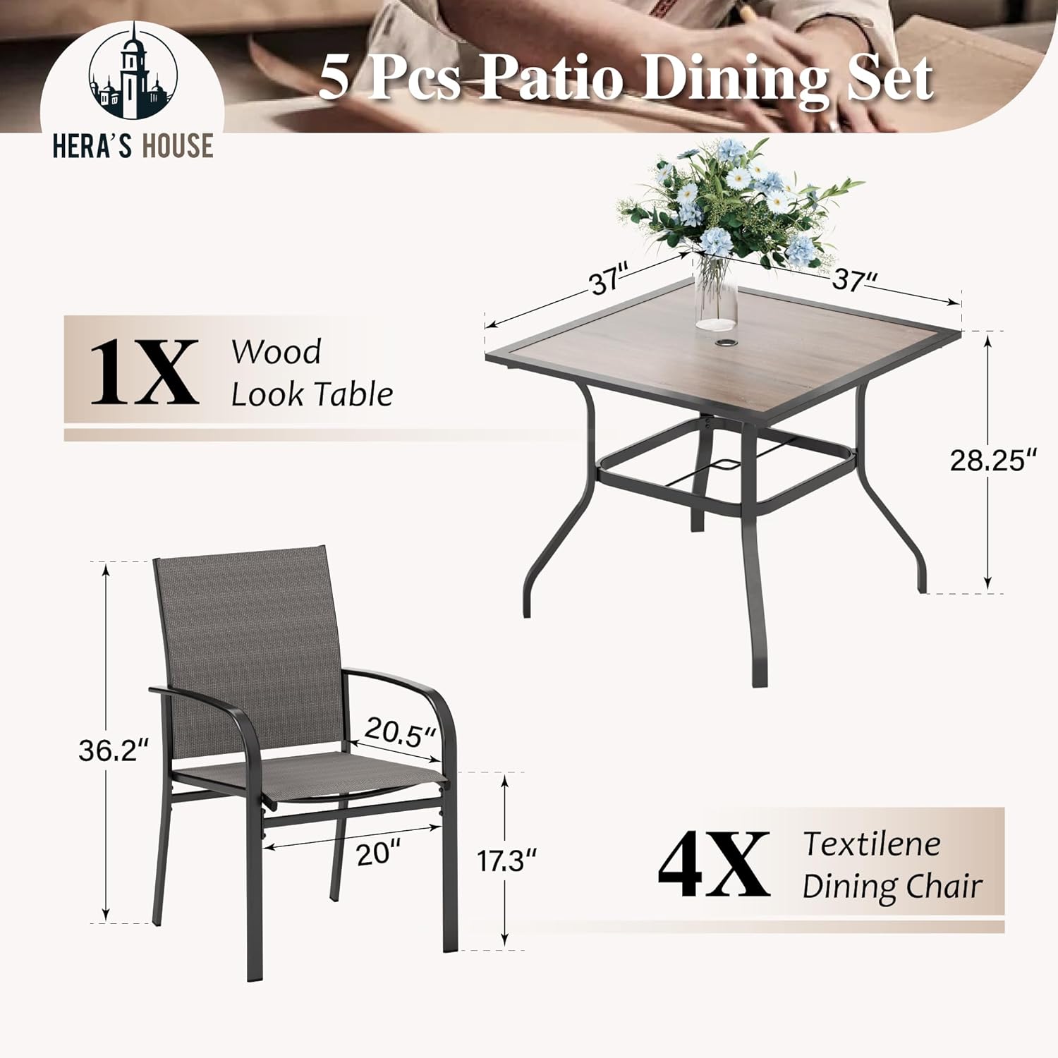 HERA'S HOUSE 5 Piece Patio Dining Set, 4 x Brown Textilene Dining Chair and 37" Square Wood-Like Dining Table with Umbrella Hole, Outdoor Table and Chairs Set for Lawn Garden Backyard Deck