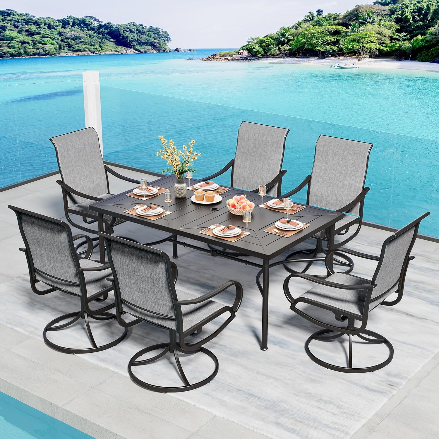PHI VILLA 7 Piece Outdoor Patio Dining Set, 6 Swivel Patio Chairs & 1 Rectangular Large Metal Table, All Weather Dining Furniture Set for Lawn Garden (Gray)