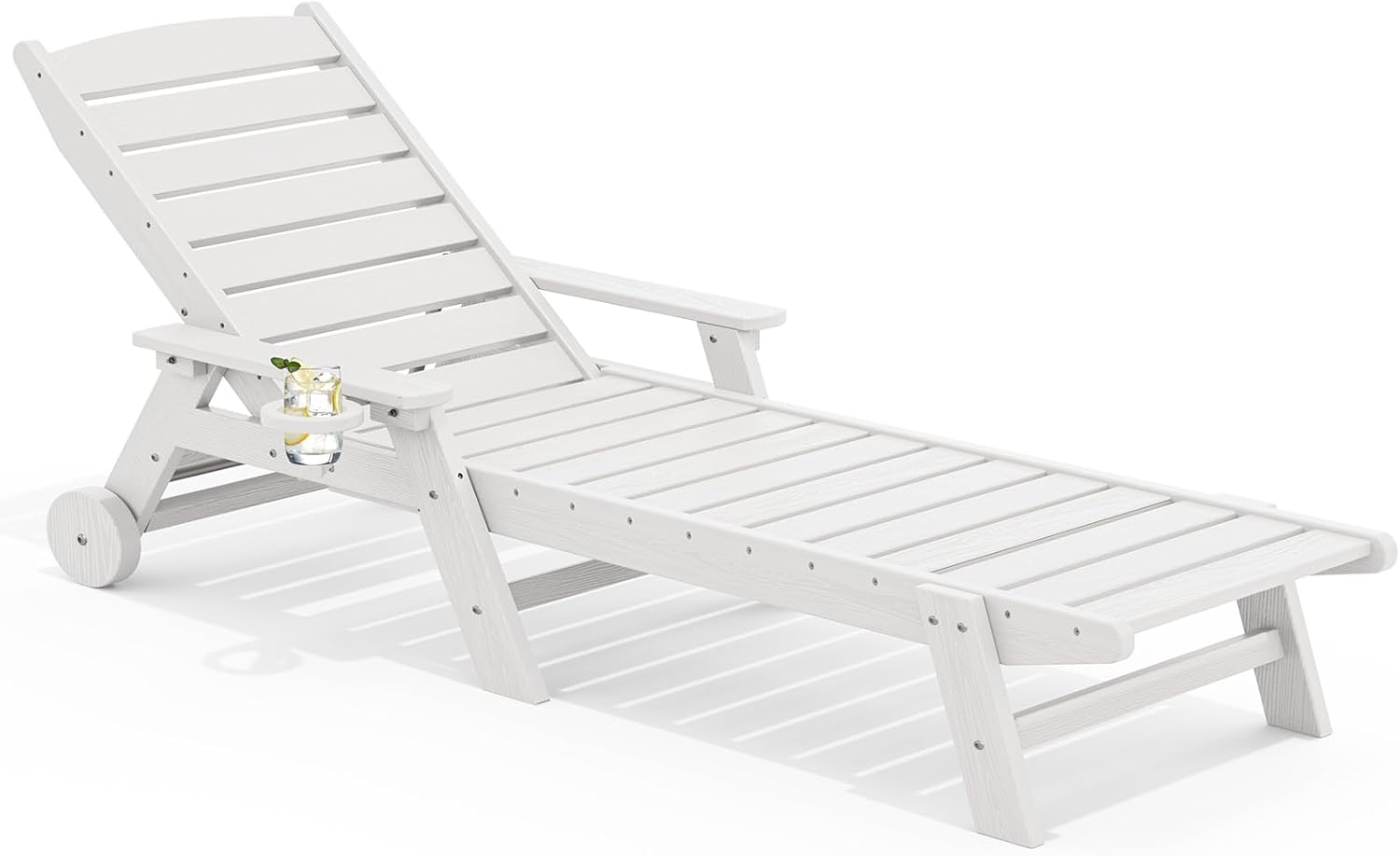 SERWALL Patio Chaise Lounge Chair, 78'' Long HDPE 5 Positions Adjustable Outdoor Lounger, Poly Lounge Chair with Rolling Wheels & Cup Holder for Pool, Light White
