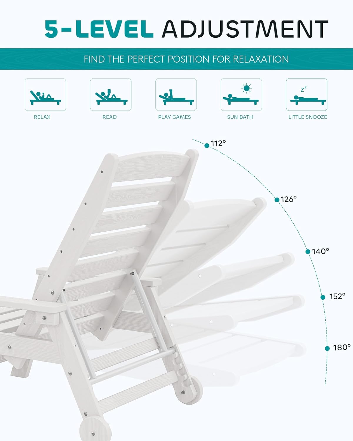 • Modern Stylish: Our HDPE adjustable patio lounge chair with wheels is available in a variety of colors, allowing you to choose one that complements your outdoor decor. Its modern design adds both comfort and practicality to any outdoor space.