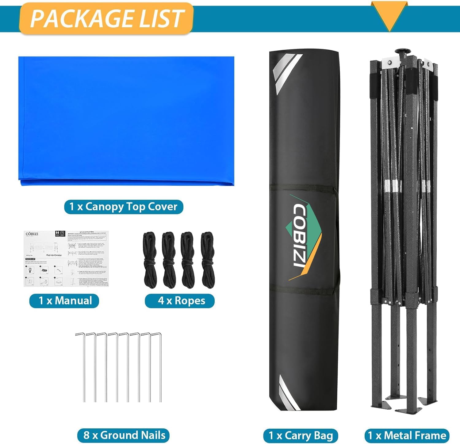 - 【43 SQ Feet Shade Area】COBIZI 6.6x6.6 pop up tent provides 43 SQFT spacious covered space, it can easily accommodate 3-5 people, meet your different needs for holding small gatherings. Perfect for wedding, birthday party, market event and other small events. When in use, always secure the 6.6x6.6 pop up tent with the included stakes and ropes to avoid damage. One year after-sale protection for canopy frame; Six months after-sale protection for fabrics and accessories.
