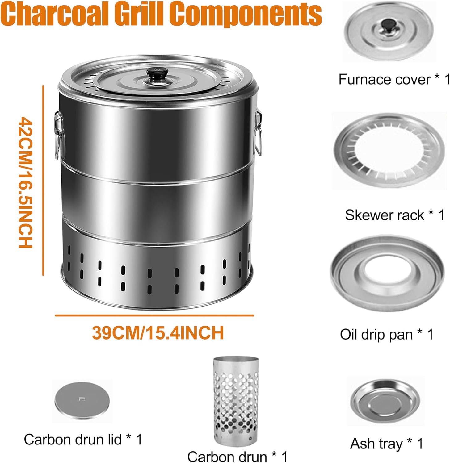 - Lay a layer of charcoal at the bottom of the charcoal drum to light it before putting charcoal all over the top, this way of aflame can improve the efficiency of the grill and make the skewers more evenly heated.Large capacity charcoal barrel bbq grill at the same time to hanging grill 28 skewers of food, according to size of the foods with about 5-10 minutes to bake through, and meet the needs of multi-person barbecue parties.