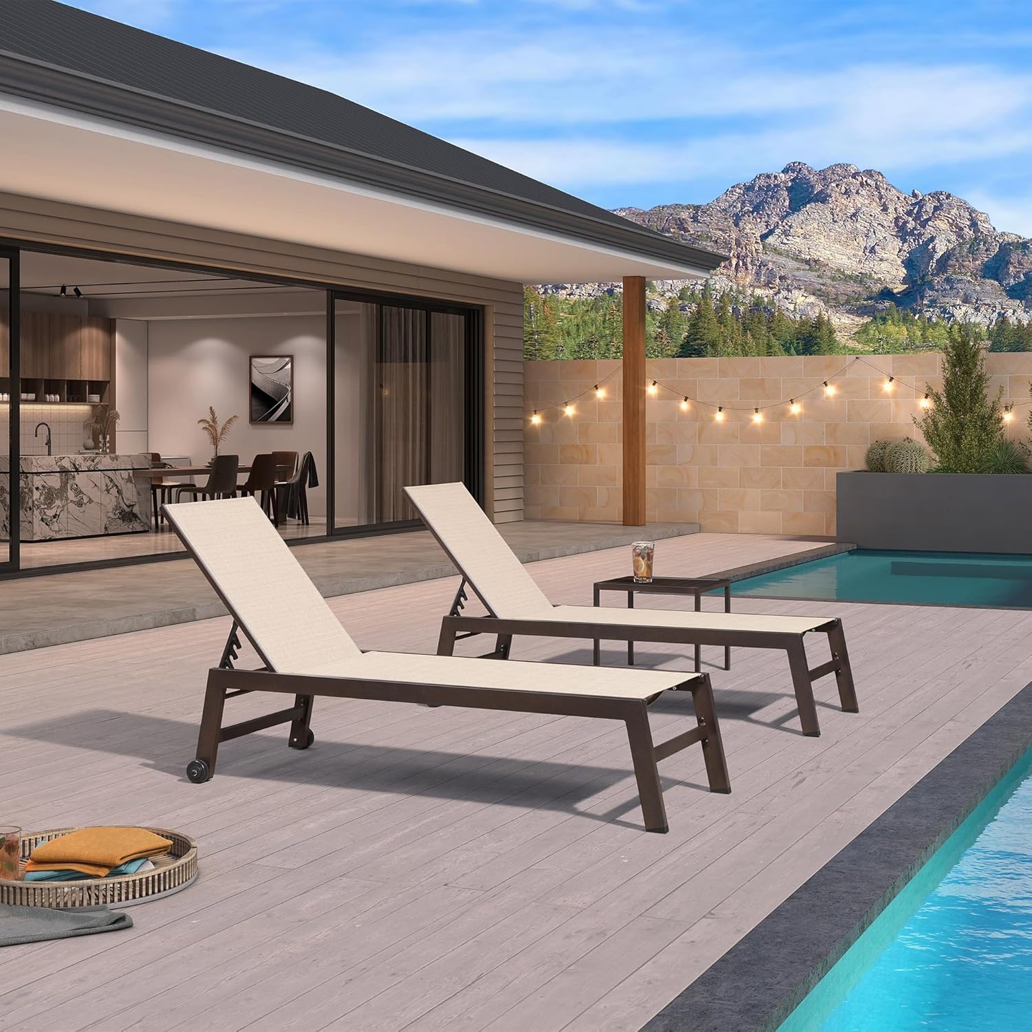 PURPLE LEAF Patio Chaise Lounge Set of 3, Outdoor Chaise Lounge with Adjustable Backrest and Wheels for Deck, Pool, Lawn, Garden, Waterproof & Easy Assembly, Cream