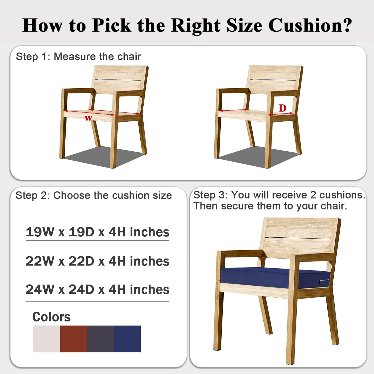 - PERFECT SIZE: Outdoor chair cushion set includes 2 cushions. Cushions measure: 19 inch (W) 19 inch (D) 4 inch (H). Fits most standard size outdoor chairs. Since the outdoor cushions are vacuum-packed, it may take 24-49 hours for the cushion foam to fluff back up after opening the vacuum bag