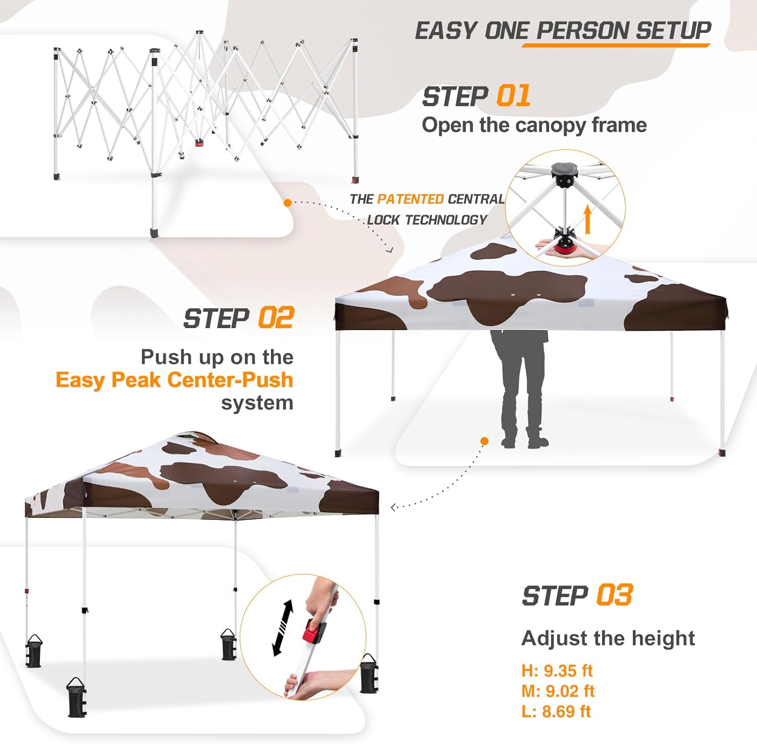 - EASY SETUP: This easy setup pop up canopy tent features the Peak Push system, a patented canopy center lock. The portable canopy requires no tools and easily opens and closes from the center in seconds. Its unique canopy tent center lock enables a quick, one person setup, letting you maximize outdoor time with minimal effort