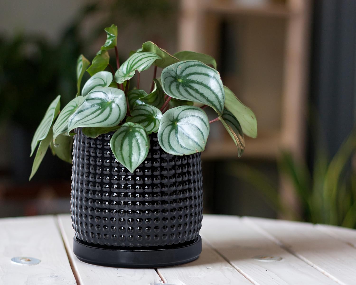 D'vine Dev 6 Inch 4 Inch Ceramic Indoor Planter Pots with Drainage Hole and Saucer, Beaded Design Flower Pots, Set of 2, Gloss Black, 27-D-U-2