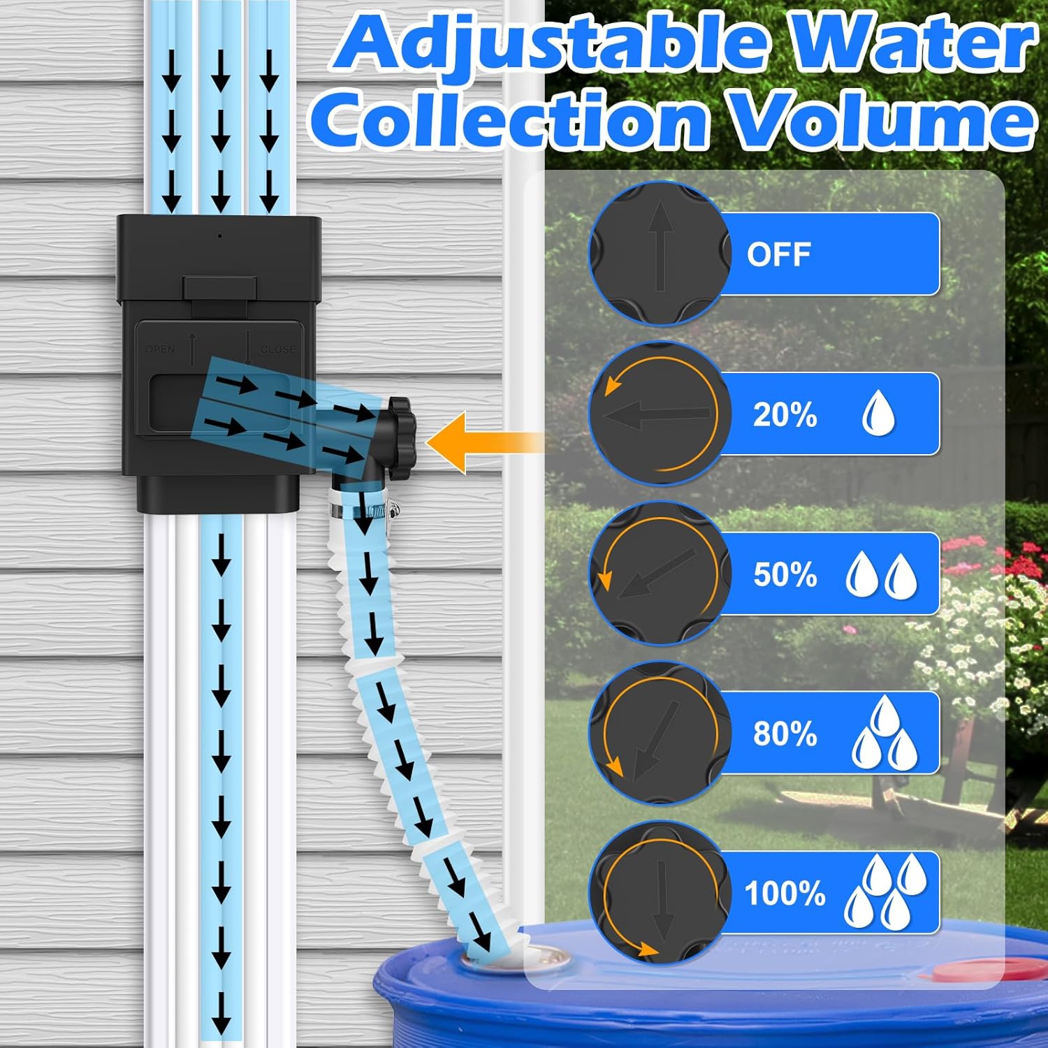 - Adjustable Water Collection: The valve of the rainwater collection system can adjust the amount of rainwater collection. There are 5 types of water flow control: closed, 20%, 50%, 80%, and 100%. If the rain barrel is full of water, you can turn off the switch to prevent rainwater from entering the rain barrel and prevent water from overflowing.