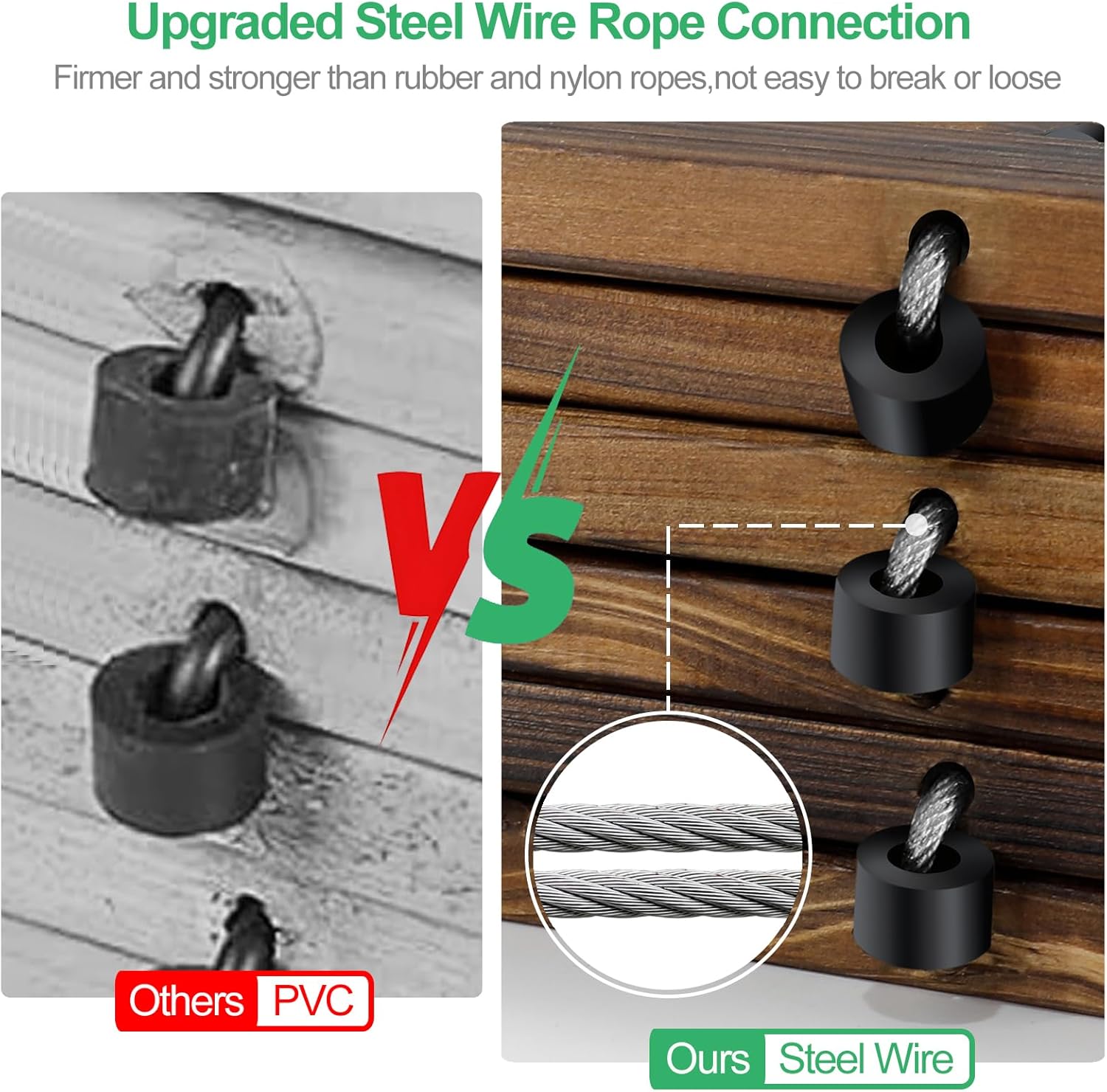- Firm Steel Wire Rope Connection:Each plank is firmly connected with 2 rows of steel wire ropes and rubber spacers,which are more aging-resistant and anti-loosening than rubber and nylon ropes,while providing better protection to the wood surface!Whatโs more,this kind of connection gives the garden wooden pathway sufficient flexibility and durability to adapt to all kinds of uneven ground,like beach,grassy road,sandy road,icy road,snowy road,gravelly road,damp or muddy ground,boggy or bare areas
