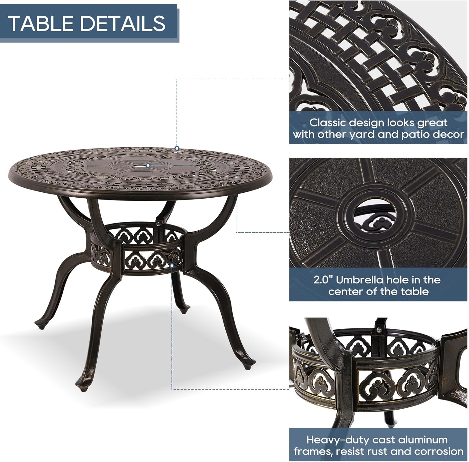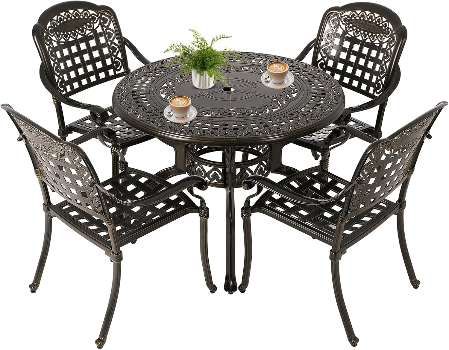 - 5-Piece Patio Dining Set: Our cast aluminum patio furniture set includes 4 chairs and 1 round outdoor dining table. This outdoor dining set has an antique bronze finish with beautiful lattice-weave and flower design, which is not only classic but also elegant. This will be the perfect addition to your outdoor space