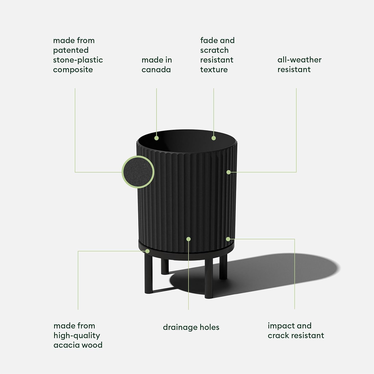 - Material : Plastic-stone composite planter & Acaia wood stand