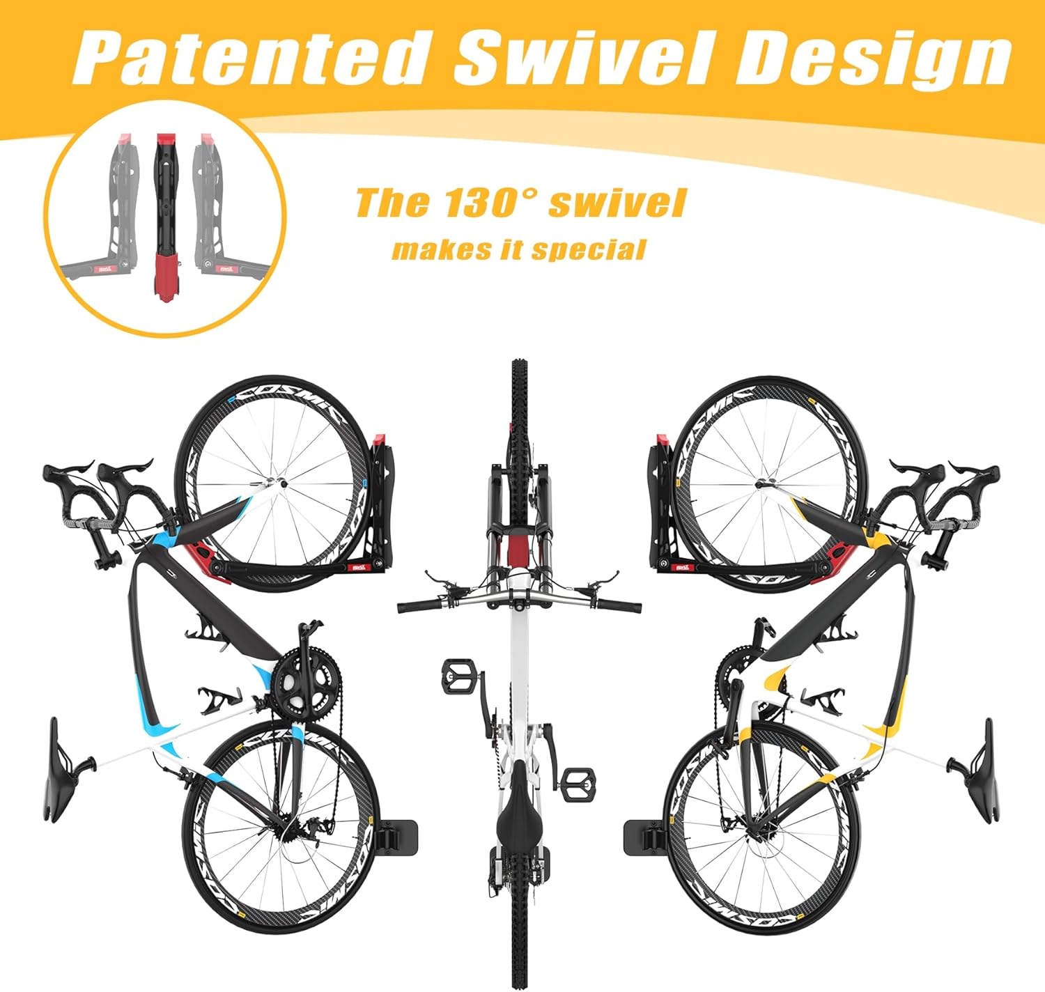 - Save Space and Easily Accessible: Patented swivel design rotates left to right, allowing easy loading and unloading of the bikes while maximizing storage space