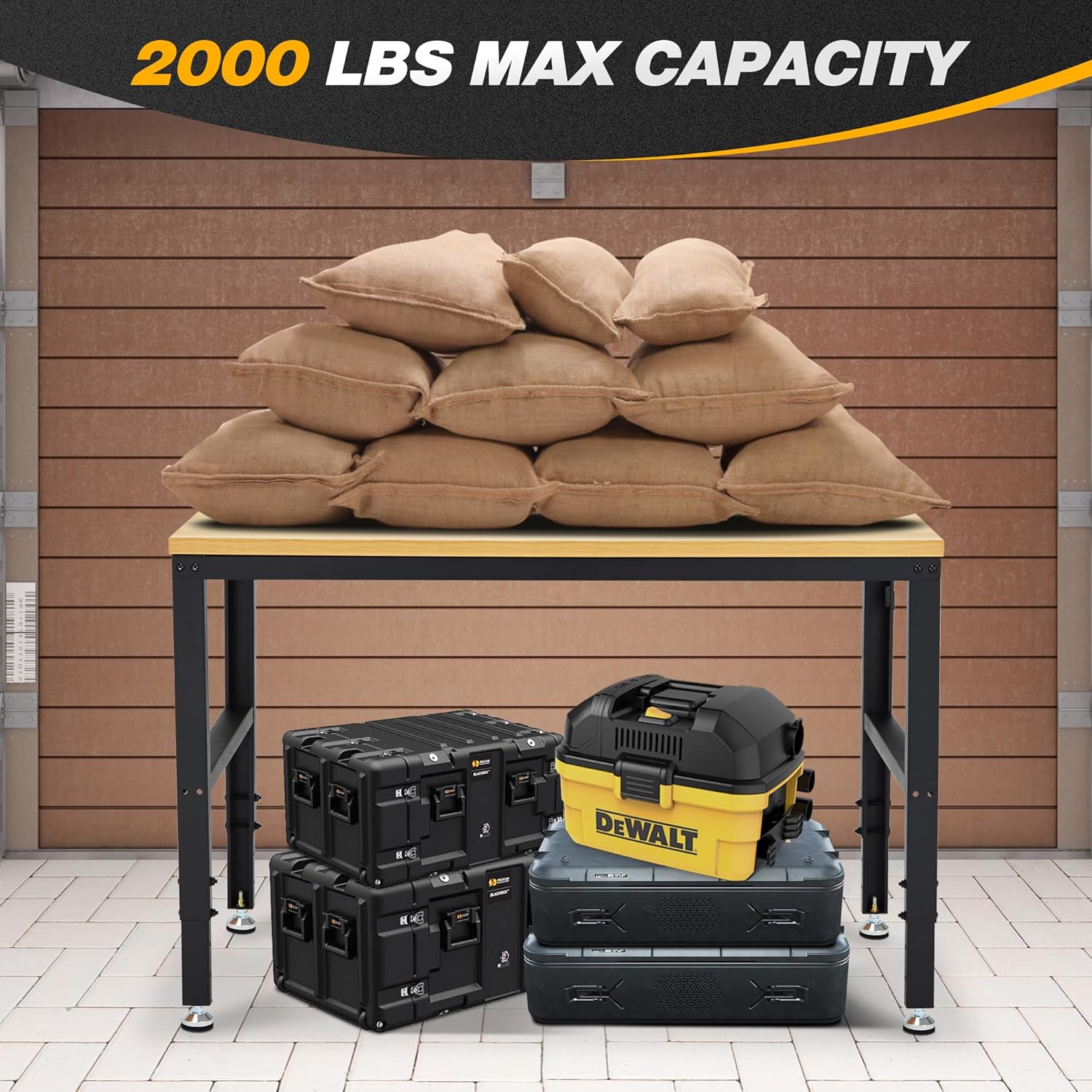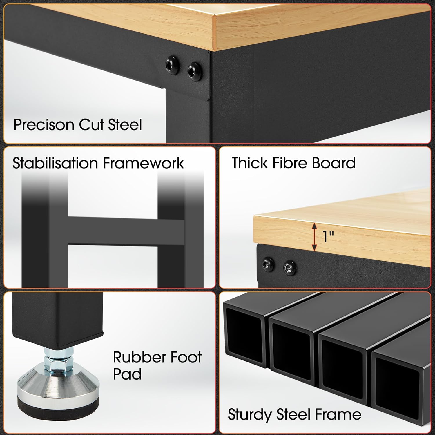 - Heavy Duty Work Bench: Constructed of high quality materials, the workbench consists of a 1" thick wood board tabletop and black textured steel frame that withstands powerful impacts up to 2000 lbs