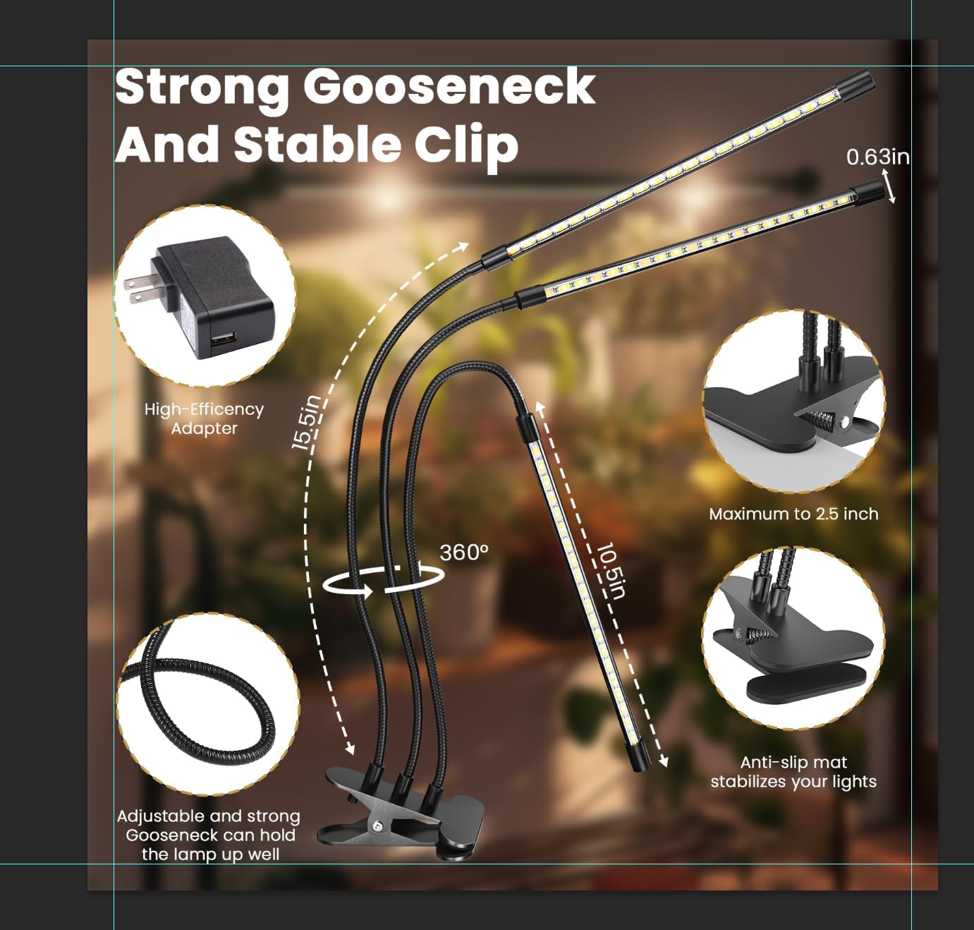 - 120°beam angle 2-head clip on grow light, equipped with flexible gooseneck and rotatable bulb.