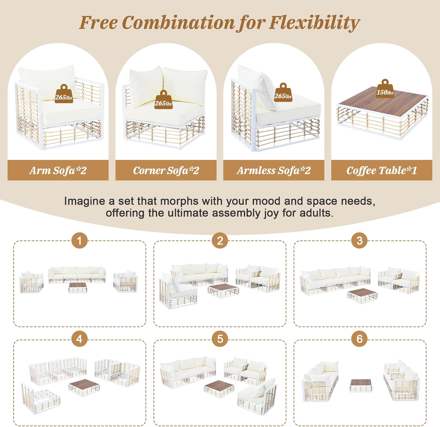 - ๐[Free Combination Sofa Set] - Imagine a set that morphs with your mood and space needs, offering the ultimate assembly joy for adults. With 2 corner sofas, 2 armless sofas, and 2 arm sofas, plus a coffee table, your patio becomes a playground for creativity. Whether hosting a large gathering or creating a cozy nook for personal relaxation, this feature allows you to tailor your outdoor area to your current needs and preferences, making it a dynamic and versatile addition to any home.
