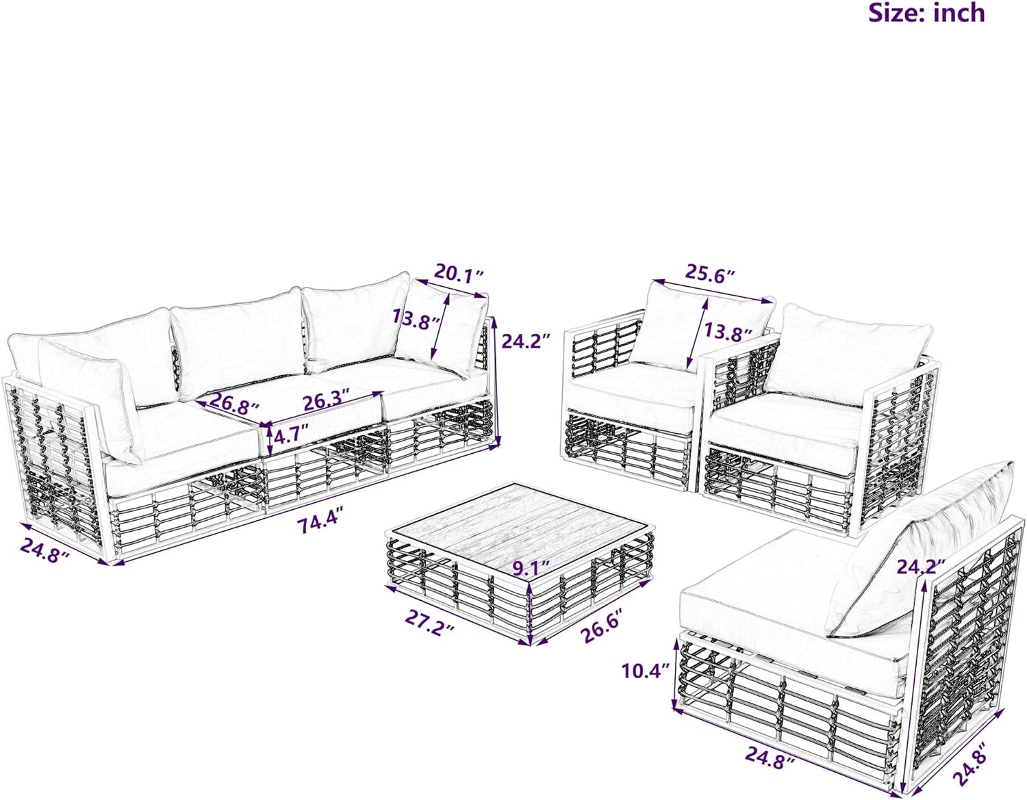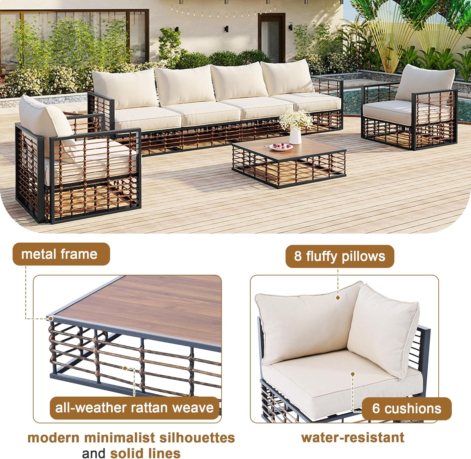 - ๐[Sturdy & Stylish Framework] - Imagine a sofa set that's as tough as your love for the outdoors, yet as stylish as your indoor decor. Our outdoor 7-piece sofa set, boasting a metal frame and all-weather rattan weave, brings modern minimalist silhouettes and solid lines as well as durability into your garden. With its robust build, your comfort zone doesn't weather away and the set supports up to 265lbs per seat and 150lbs for the coffee table, ready to hold everything from day coffee to night candles.