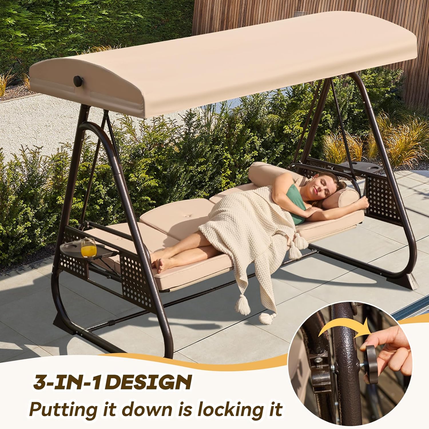 3 in 1 Outdoor Porch Swing with Adjustable Canopy, 3 Seat Outdoor Swing for Adults, Patio Swing Chair with Thickened Cushions,Pillows & Cup Holders for Backyard, Porch, Garden (Khaki)