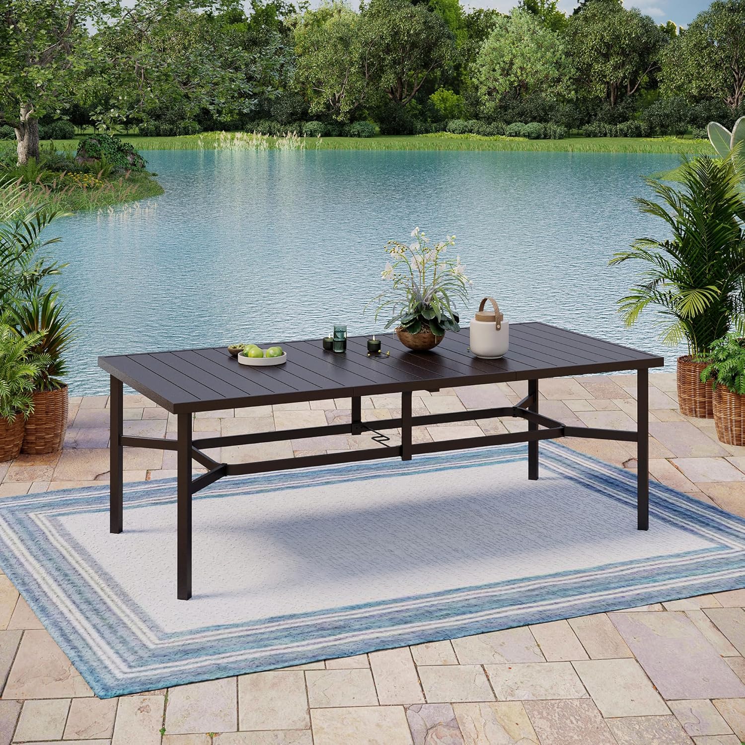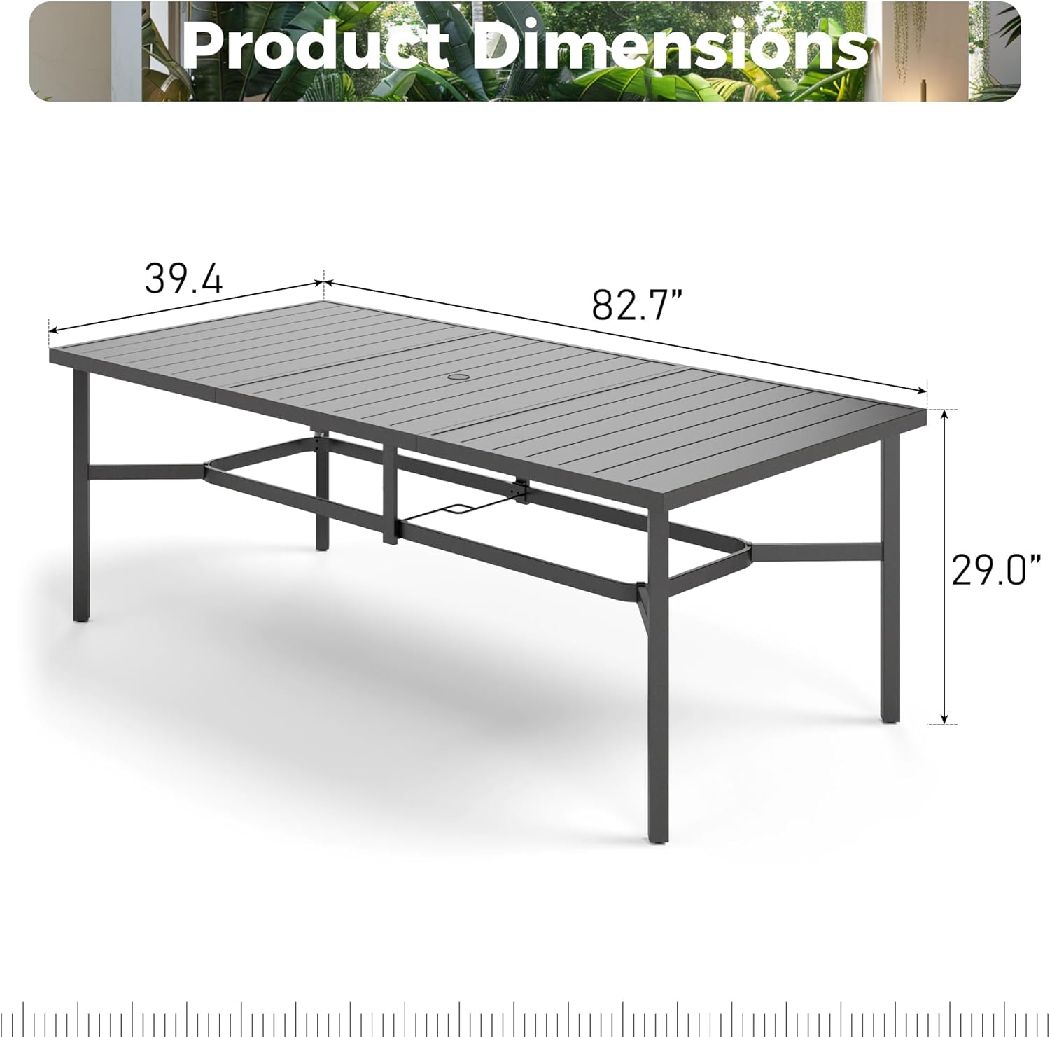 - Large Dining Table: L 83" x W 39" x H 29"; Diameter of umbrella hole:1.7", Suit for 8 people, 1.7" diameter of umbrella hole fits patio umbrellas which can protect you from the bright sun