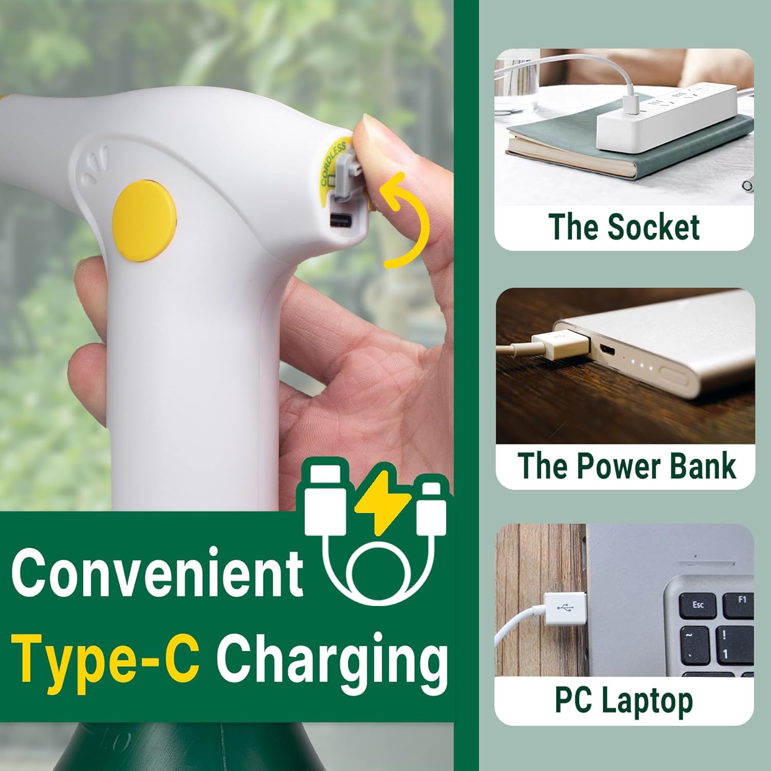 - 【Rechargeable & Last Long】This electric sprayer bottle comes with a Type-C USB cable but CHARGER IS NOT INCLUDED. The charge port hidden on the handle is well covered for watering-proof consideration. Charging the battery to full will last this electric plant sprayer working for a long time.