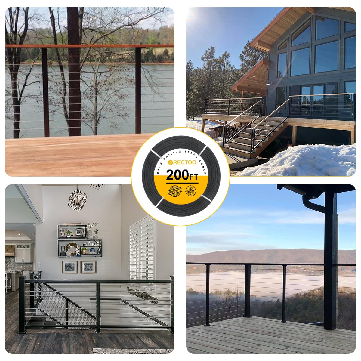 Black 200FT 1/8" T316 Stainless Steel Cable with Cutter, 7x7 Strands Aircraft Wire Rope for Deck Railing, Stair Handrail, Porch Fence, High Strength for Indoor and Outdoor Use