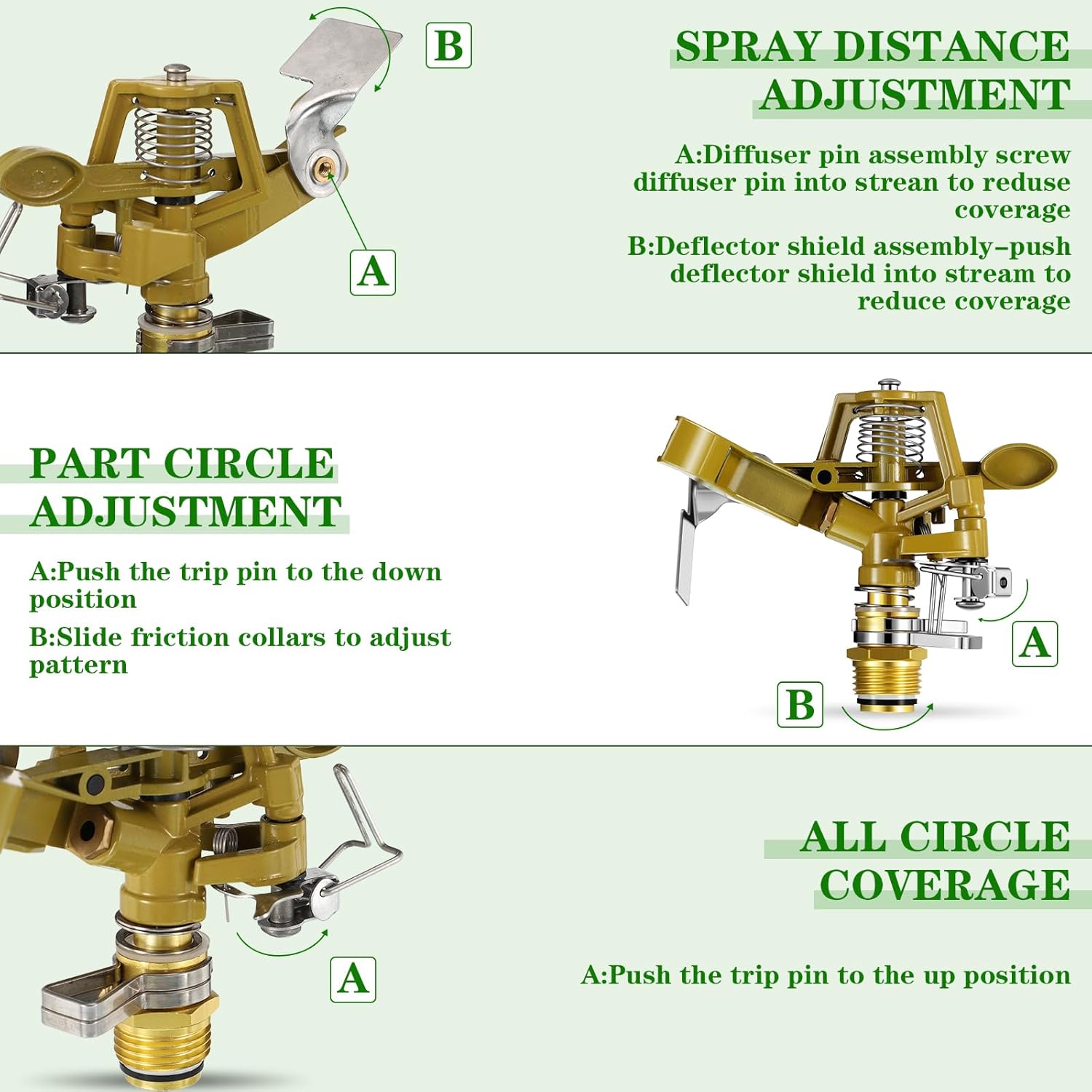- Easy installation: the adjustable 0-360 degrees pattern impact sprinkler head with nozzle is easy for you to use, just find the spiral on the item at first, then put it on the spiral of the watering device and rotate it, in order to avoid water leakage, you need to tighten it slightly