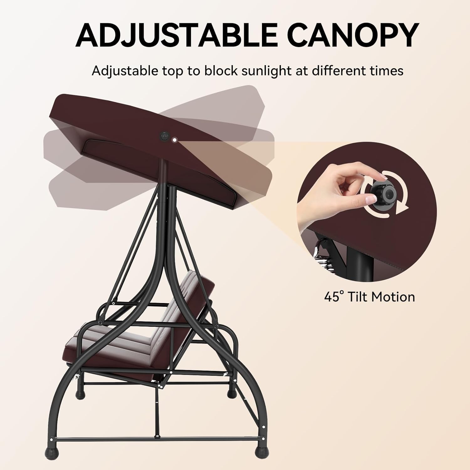 - 【45 DEGREES ADJUSTABLE CANOPY】The canopy of covered porch swing with reinforced adjustable knob, adjust and securely fix the suitable angle. Adjust the angle of the canopy (up to 45-degrees) forward and backward to block the sun all day long.