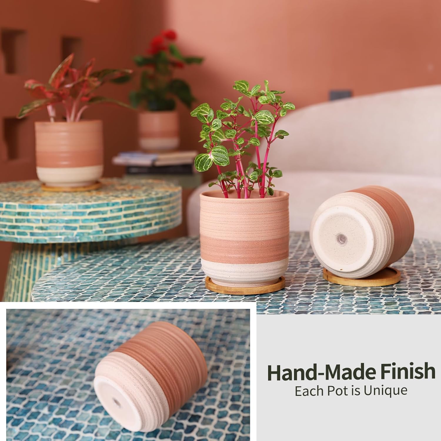 5.25 Inch Ceramic Planter Pot for Indoor Plants with Drainage Holes, Coarse Glazed Gradient Color Flower Planter Pots with Bamboo Saucer, for Succulent, Snake Plants, Cactus & Herbs, Set of 4