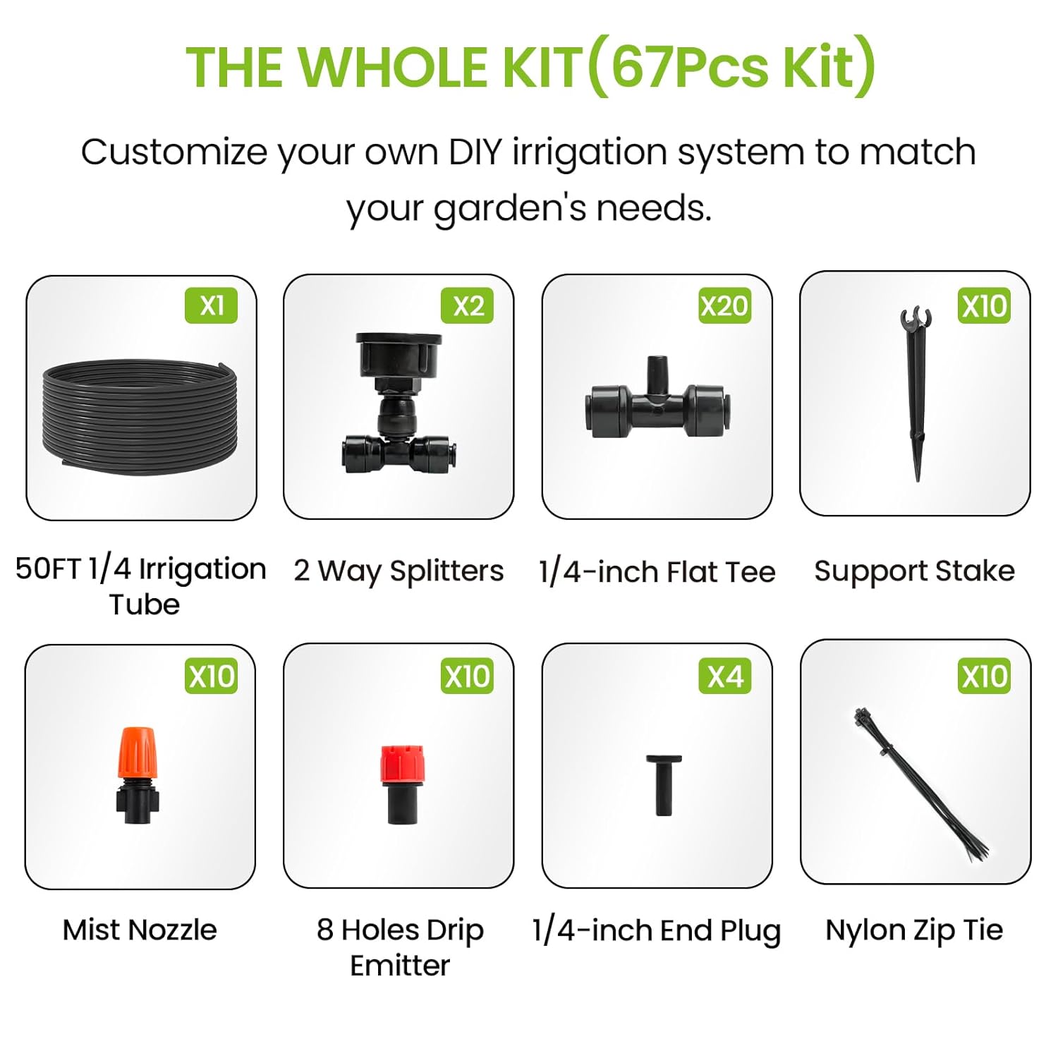 - [The Whole Kit to DIY Your Drip Irrigation System]: MIXC automatic drip irrigation kit includes 50FT 1/4'' black tubing, 2Pcs Two-way Connector, 10Pcs Mist Nozzle, 10Pcs 8 Holes Drip Emitter, 10Pcs Detachable Support Stake, 20Pcs 1/4-inch Flat Tee, 4Pcs 1/4-inch End Plug, 10Pcs Nylon Zip Tie, without having to buy any more tools.