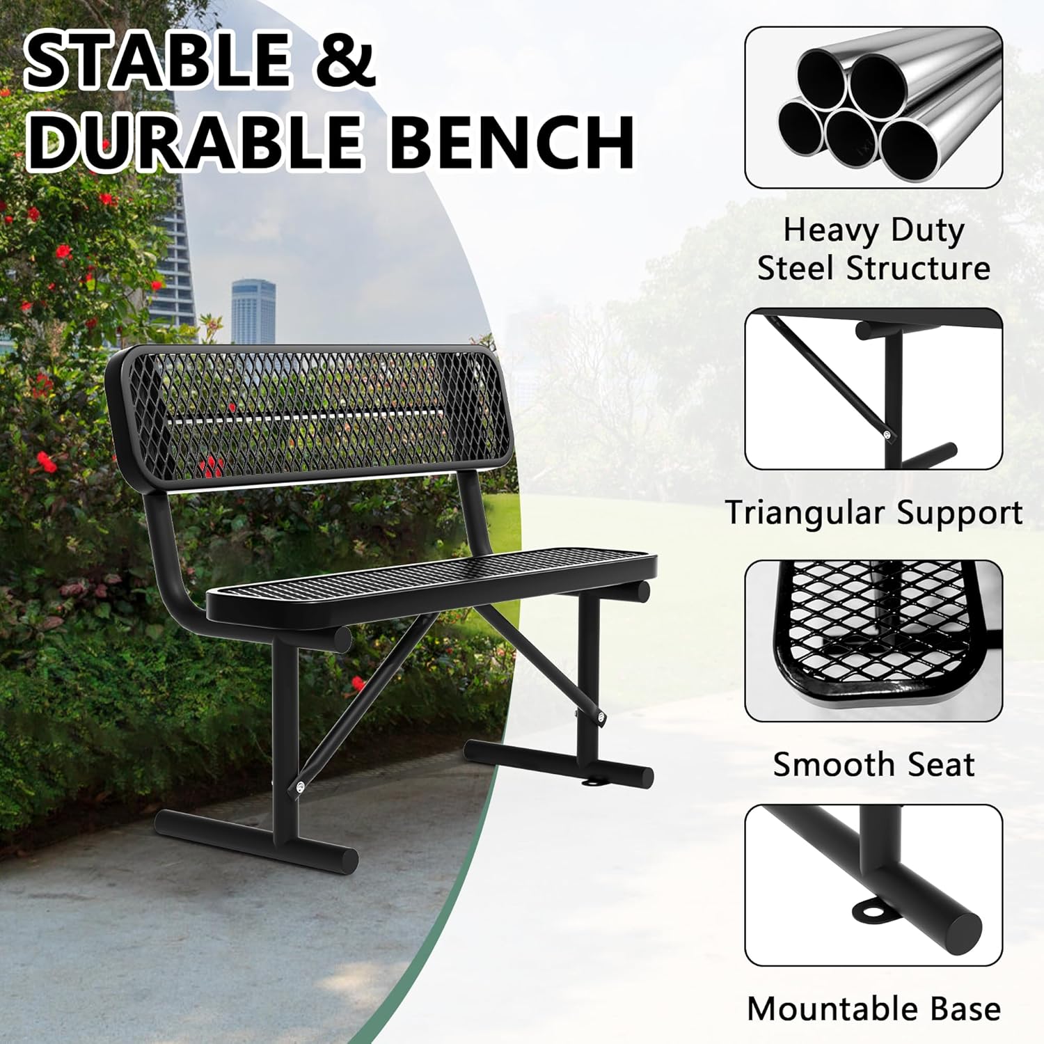 4 FT Heavy Duty Metal Park Bench with Back for Outside, Outdoor Black Bench with Backrest & Portable Frame, 1-3 Person Seat-Commercial Benches Garden Benches for Outdoors