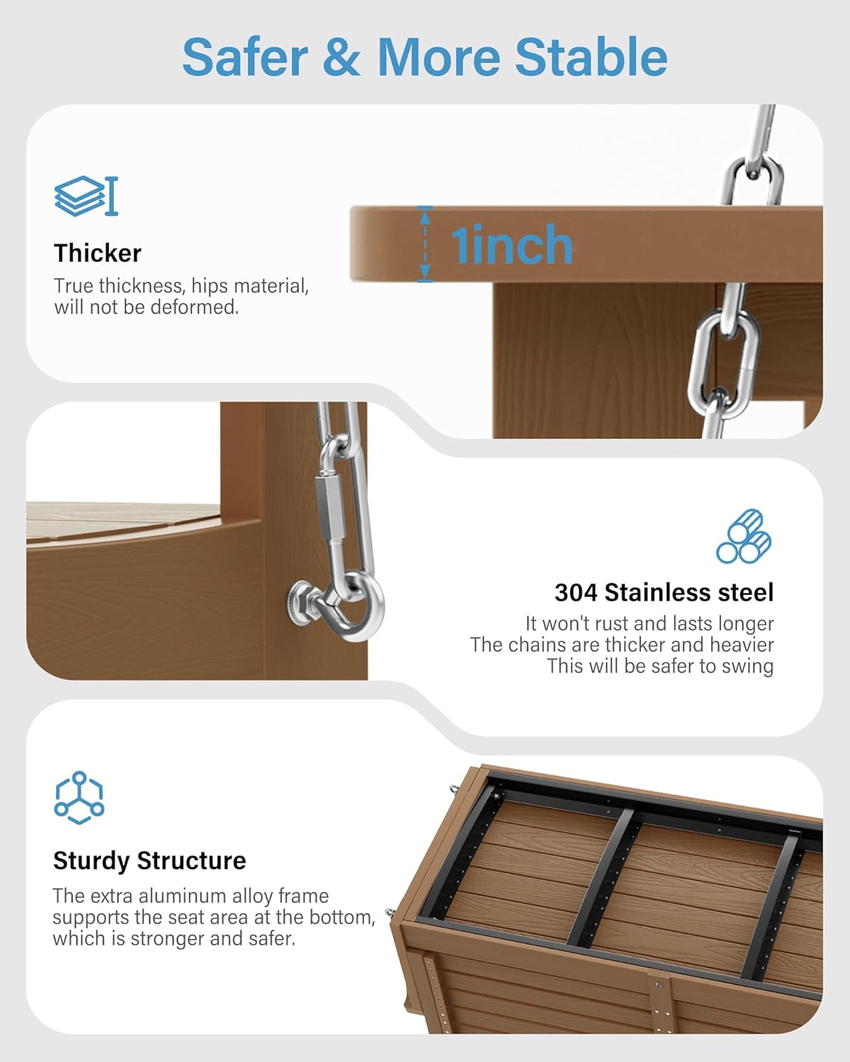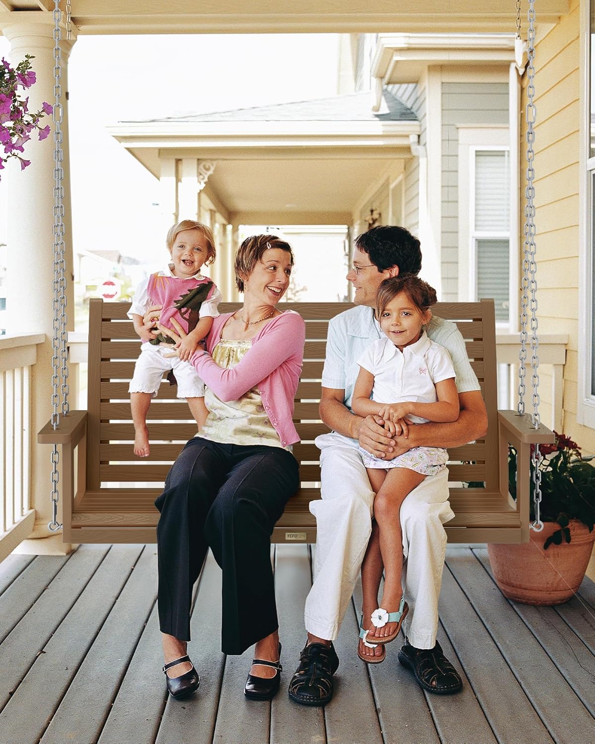 - Material: HIPS material can be resistant to wind and rain. YEFU porch swing does not need to be painted and maintained every year. It can be cleaned with soapy water.The hardware is made of 304 stainless steel, which will not rust. The surface is treated with wood grain to look like real wood.