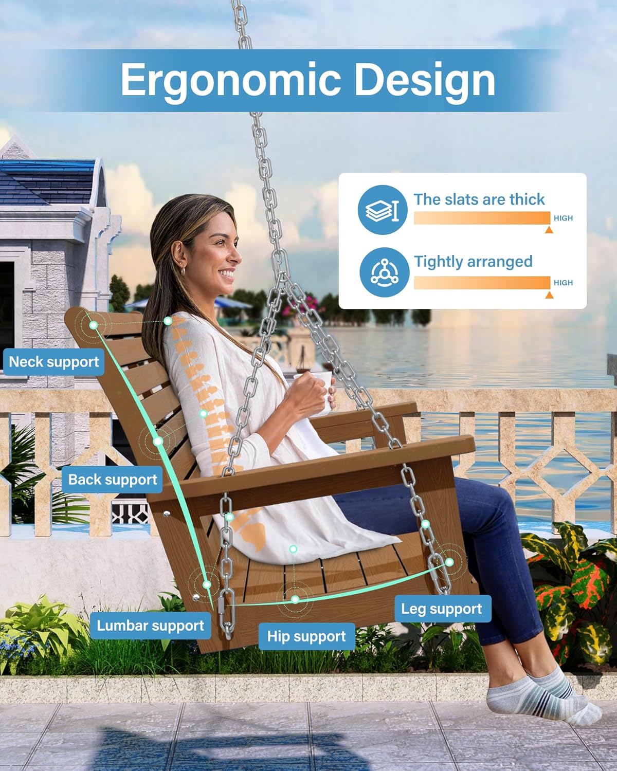 - Ergonomic Design: The slats of yefu porch swing are arranged closely. The backrest and seat area provide better support for your body. The seat area is designed to roll back to fit your legs. Paired with the YEFU double cushion, it will become a comfortable swing chair for family and friends to enjoy a moment of relaxation.