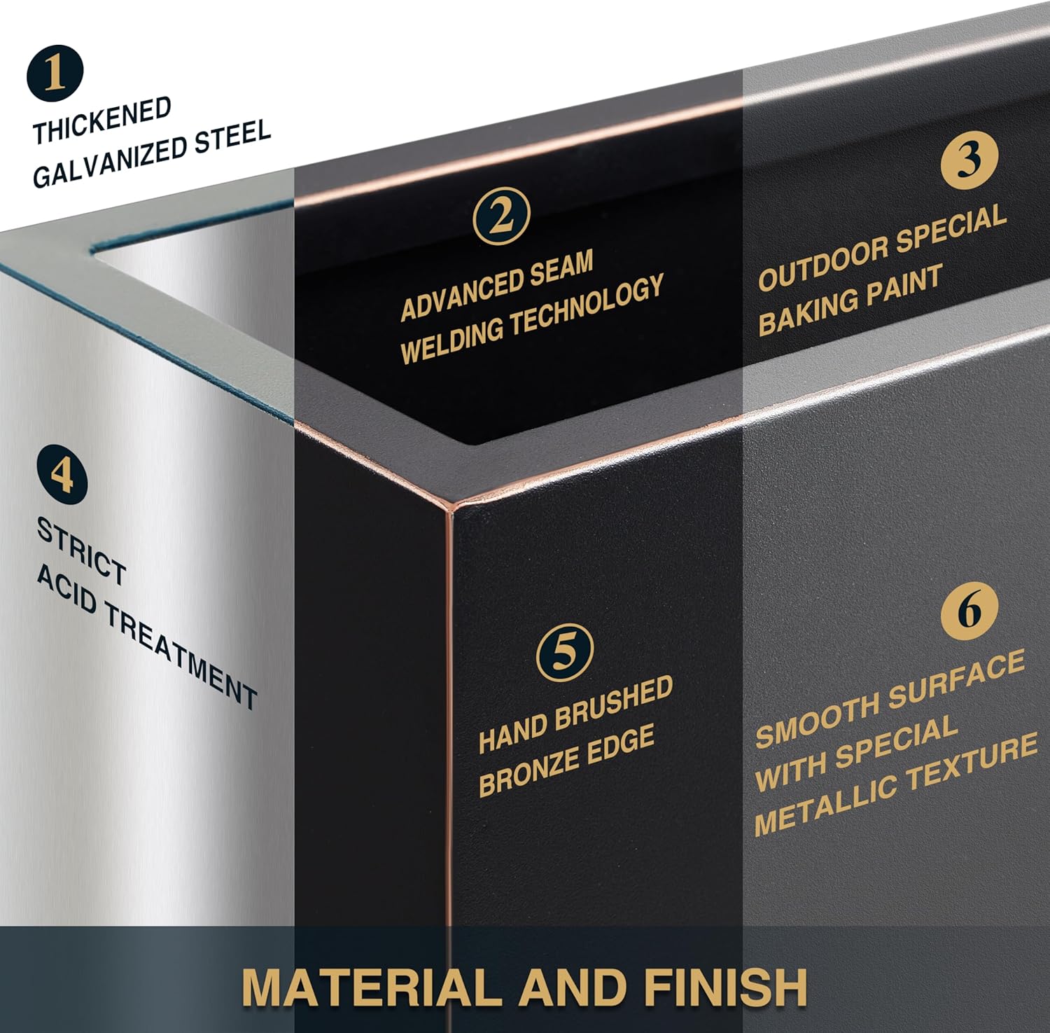 - METALLIC HEAVY PLANT BOX: This planter box is made from a fully seam welded thick galvanized steel, and adopts outdoor special baking paint, giving the surface a premium metallic color and special texture through the advanced powder injection process.